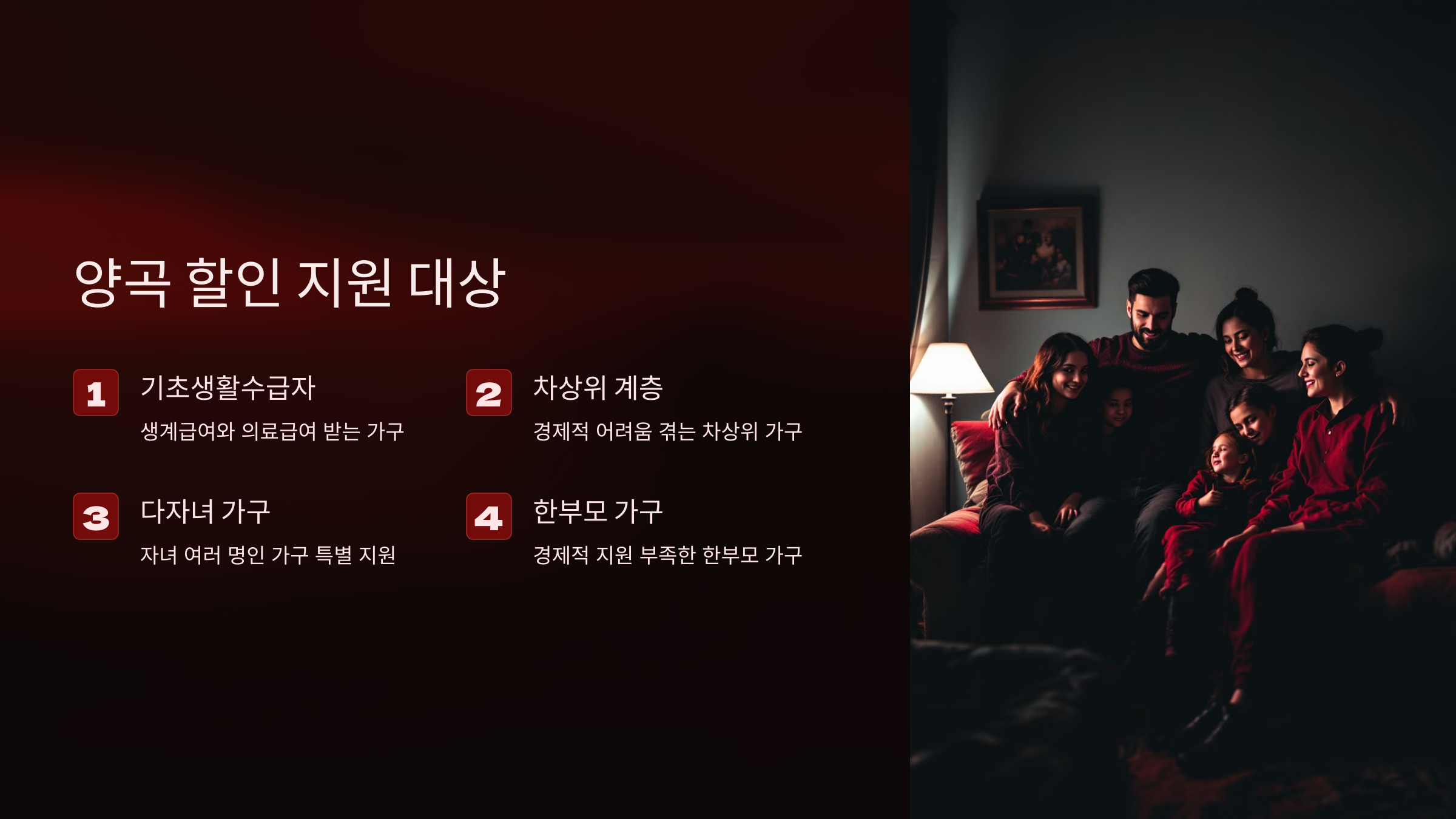 양곡 할인 제도는 경제적 어려움을 겪고 있는 저소득층 가구를 위한 사랑 가득한 지원 프로그램입니다. 주된 지원 대상은 다음과 같습니다: