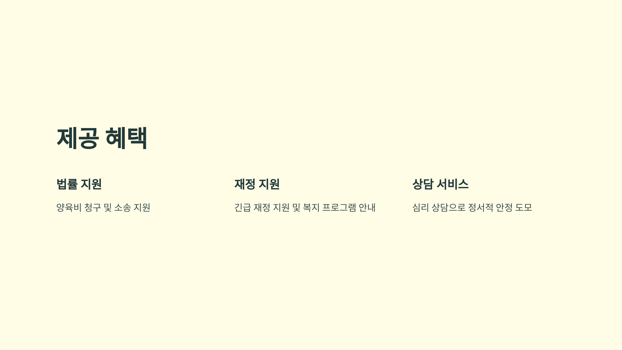 - 재정 지원: 양육비를 받지 못해 생활이 어려운 부모에게 긴급 재정 지원을 제공합니다. 정부의 보조금이나 복지 프로그램에 대한 정보를 안내받을 수 있습니다.