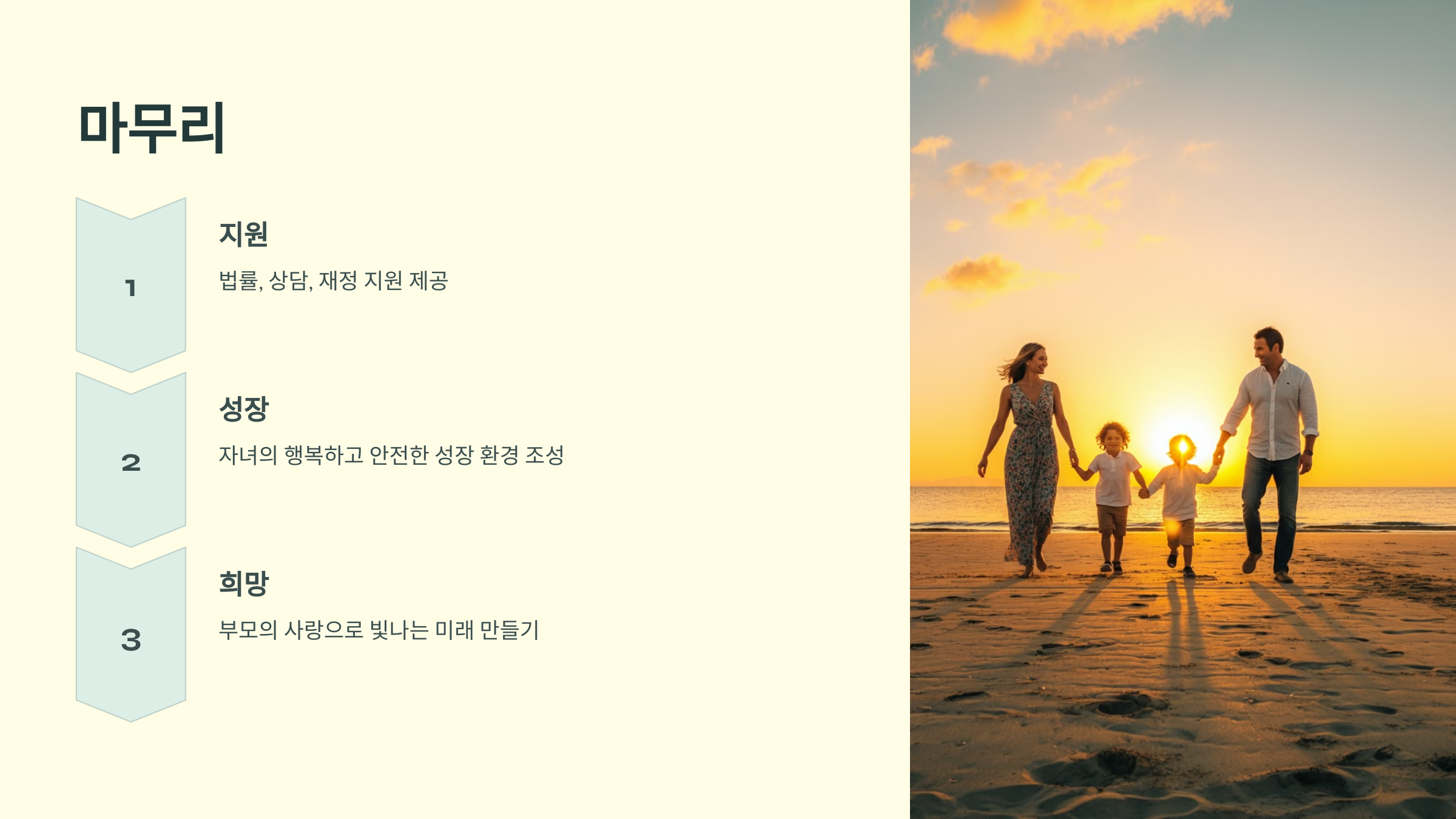 양육비로 어려움을 겪고 계신 부모님들께 따뜻한 마음을 전합니다. '양육비 이행 원스톱 종합 서비스'는 여러분과 사랑하는 자녀를 위해 존재합니다. 이 서비스를 통해 필요한 법률, 상담, 재정 지원을 받아 소중한 자녀가 행복하고 안전하게 성장할 수 있는 환경을 만들어 나가길 바랍니다. 여러분의 사랑이 자녀에게 가장 큰 힘이 되며, 그 사랑이 빛나는 미래를 함께 만들어 갈 수 있도록, 언제나 여러분을 응원하겠습니다. 필요한 지원을 꼭 신청하시고, 함께 이 길을 걸어가요. 사랑과 희망이 가득한 하루가 되시길 바랍니다!
