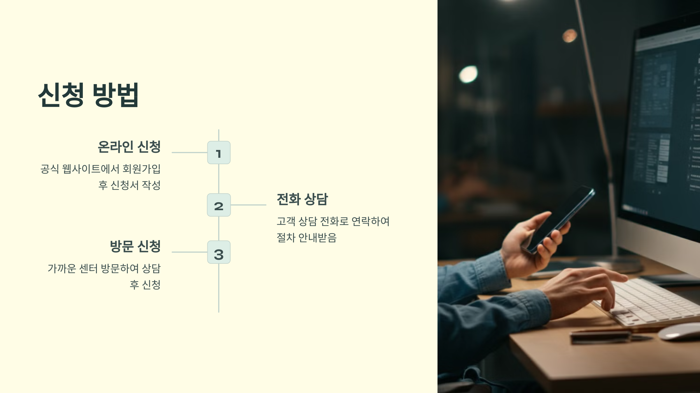 - 상담 및 신청: 상담원과 직접 상담 후 신청서를 작성하고 필요한 서류를 제출합니다.