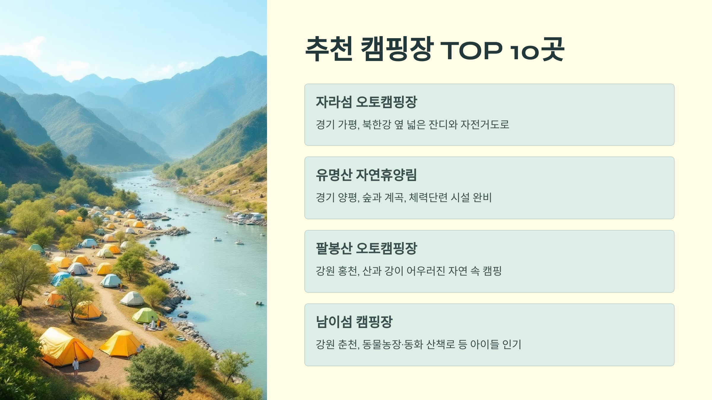 | 1 | 자라섬 오토캠핑장 | 경기 가평 | 북한강 옆 넓은 잔디와 자전거도로 |