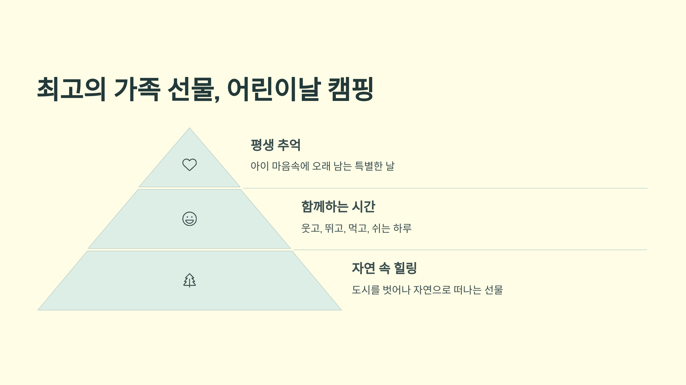 어린이날은 단 하루지만, 그 하루가 아이의 마음속엔 오래 남습니다. 자연 속에서 함께 웃고, 뛰고, 먹고, 쉬는 하루. 캠핑은 최고의 가족 선물이 될 수 있어요. 이번 어린이날, 도시를 벗어나 자연으로 떠나보는 건 어떨까요?