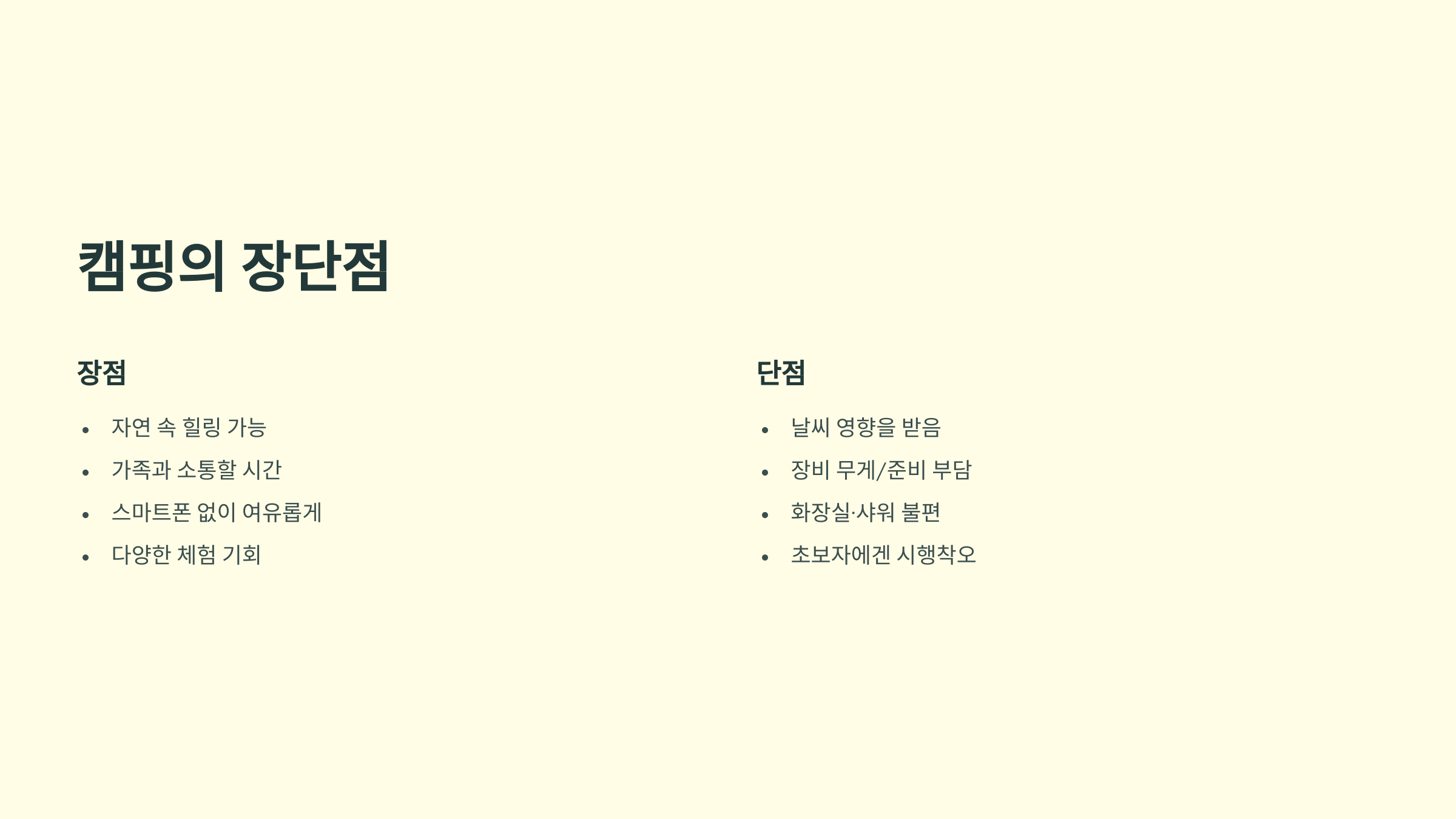 | 가족과 소통할 시간 | 장비 무게/준비 부담 |