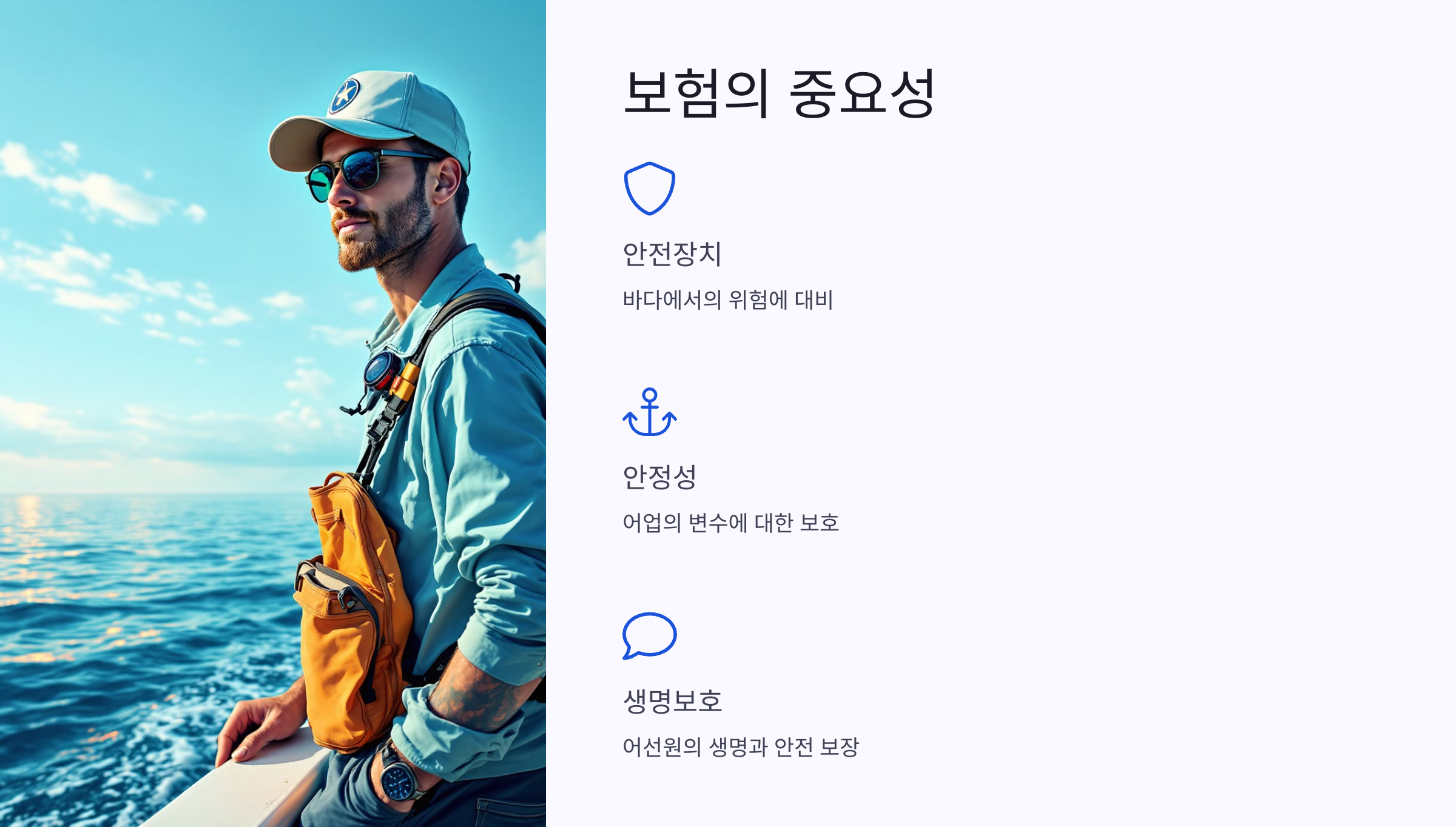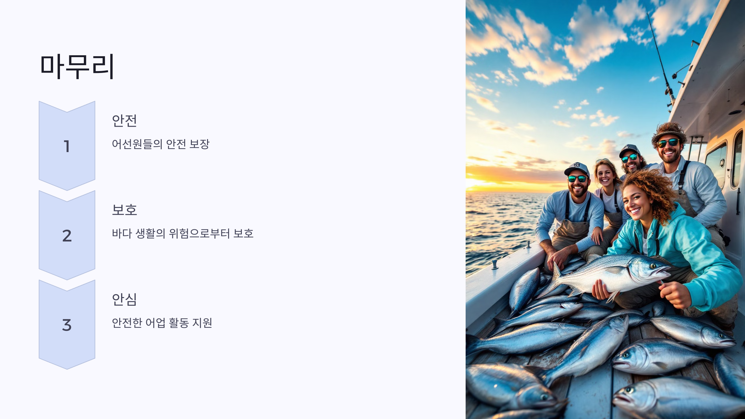 어선원 및 어선 재해보상보험은 바다에서 일하는 사람들이 안전하게 일할 수 있도록 돕는 중요한 안전장치예요. 어업은 언제나 바람과 파도가 변수로 작용하는 힘든 일이에요. 이런 보험이 있음으로써 바다에서의 위험에 조금 더 든든하게 대비할 수 있는 것이죠.