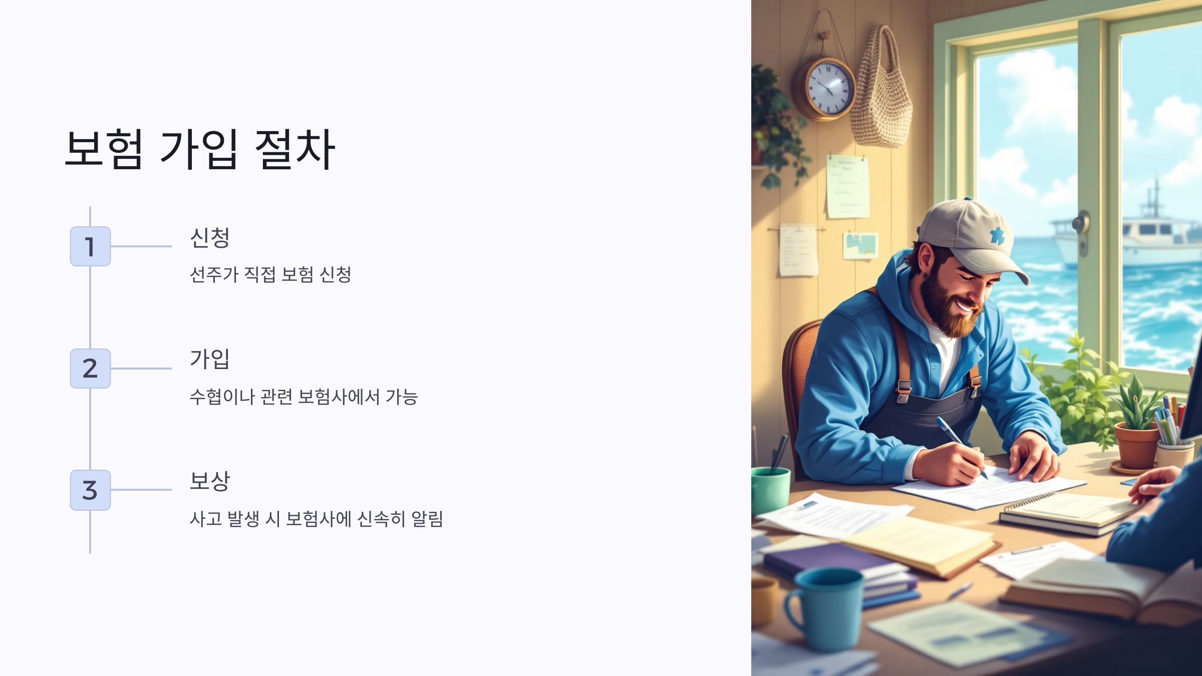 어선원 및 어선 재해보상보험에 가입하려면 먼저 선주(어선을 운영하는 사람)가 직접 보험을 신청해야 해요. 보험 가입은 어업인이라면 쉽게 접근할 수 있는 수협이나 관련 보험사에서 가능해요. 그리고 가입 후에는 어선원들이 조업 중에 발생할 수 있는 다양한 사고에 대비한 보상 혜택을 받을 수 있어요. 만약 바다에서 사고가 발생했다면, 사고 발생 사실을 보험사에 신속히 알리고, 필요한 서류를 준비해서 보상 절차를 시작할 수 있어요.