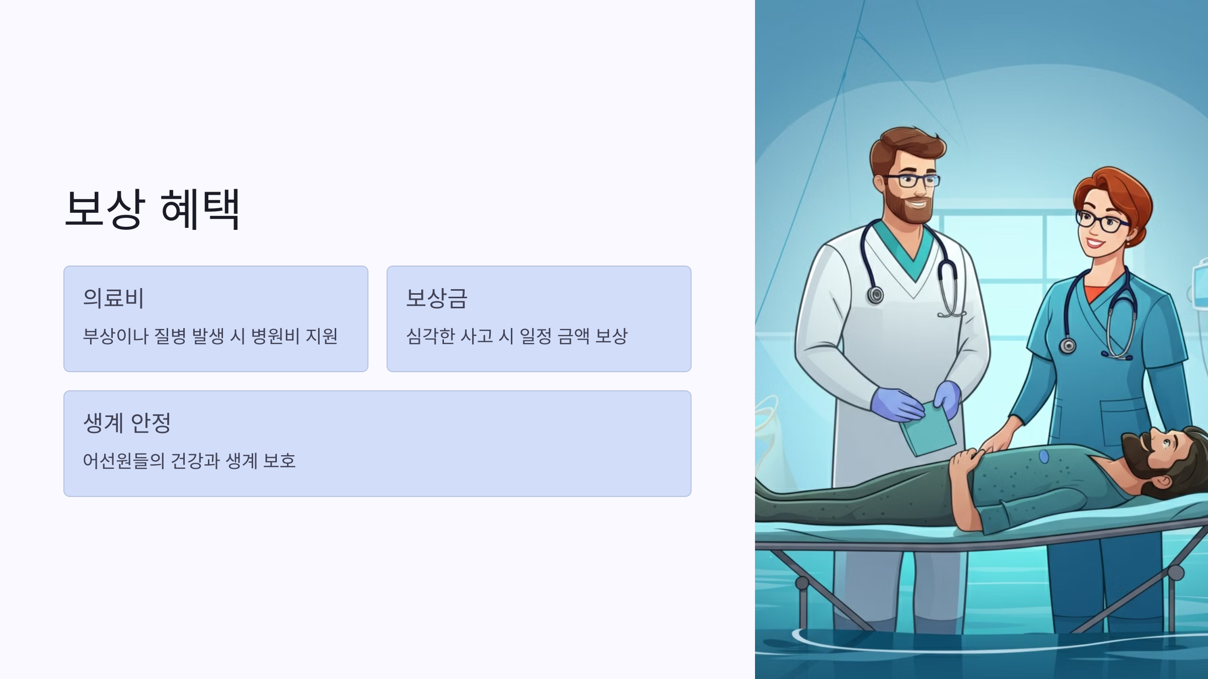 어선원 및 어선 재해보상보험은 어선원이 일하다가 다치거나 불의의 사고를 당했을 때 다양한 보상 혜택을 제공해요. 예를 들어, 바다에서 다쳤거나 일과 관련해 병이 생겼을 때 병원비를 지원받을 수 있고, 심각한 부상이나 사고가 발생한 경우 일정 금액의 보상금도 받을 수 있어요. 이런 혜택들은 어선원들의 건강과 생계를 안정적으로 지키는 데 큰 도움이 된답니다.