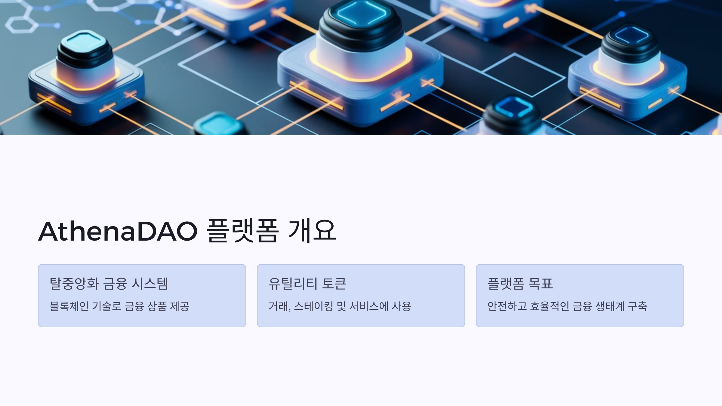 AthenaDAO는 탈중앙화된 금융 시스템(DeFi)을 제공하는 플랫폼으로, 블록체인 기술을 활용하여 금융 상품을 제공합니다. ATH 토큰은 이 플랫폼의 중심이 되는 유틸리티 토큰으로, 플랫폼 내에서 거래, 스테이킹 및 다양한 서비스에 사용됩니다. AthenaDAO의 목표는 전통적인 금융 시스템을 대체할 수 있는 안전하고 효율적인 금융 생태계를 구축하는 것입니다.