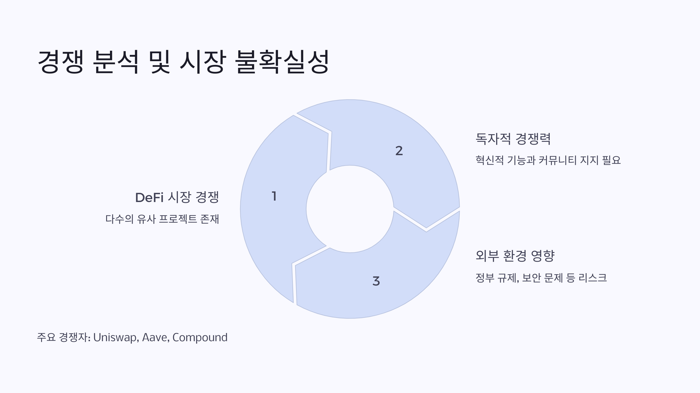 - ATH는 DeFi 시장에서 이미 많은 경쟁자들이 존재하는 가운데 경쟁해야 합니다. 주요 경쟁자들로는 Uniswap, Aave, Compound와 같은 다른 탈중앙화 금융 플랫폼들이 있습니다. ATH는 독창적인 기능과 강력한 커뮤니티 지지가 필요합니다.