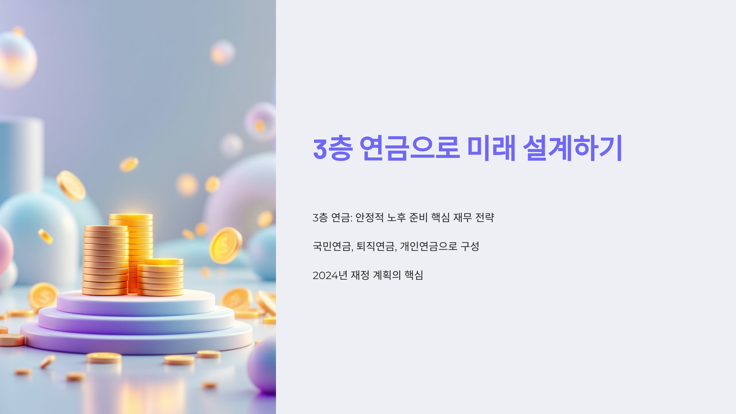- 국민연금을 통해 안정적인 기본 소득을 확보하며, 퇴직연금과 개인연금으로 이를 보완 가능.