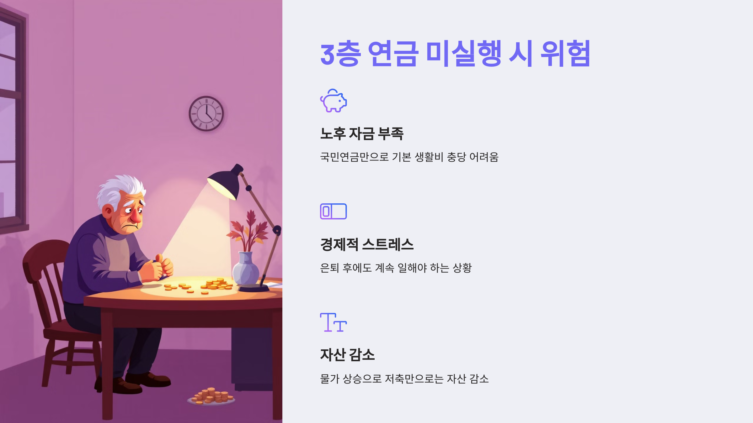 3층 연금을 준비하지 않을 경우, 다음과 같은 위험이 있습니다: