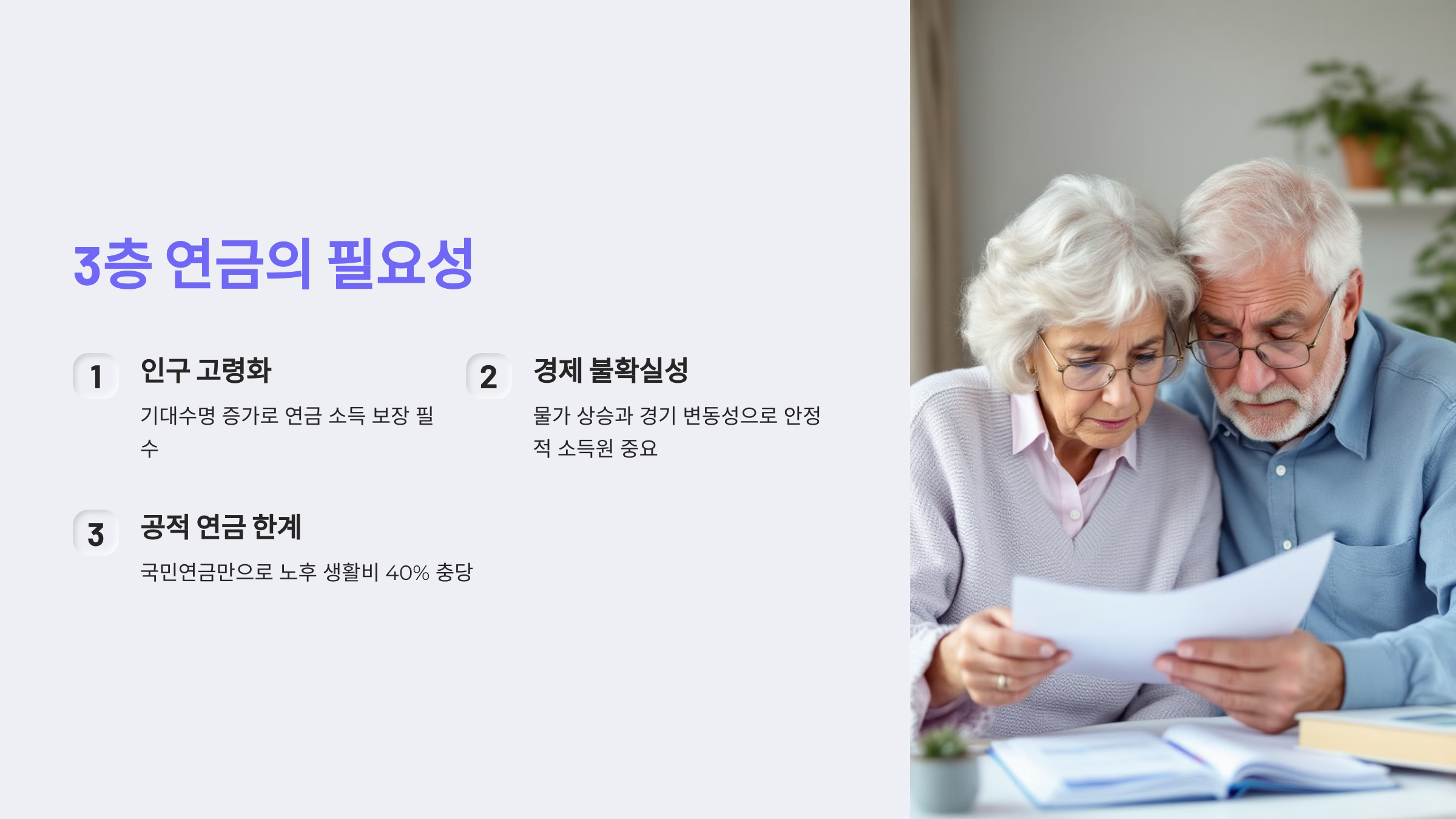 - 인구 고령화: 기대수명이 점점 늘어나면서 연금을 통한 소득 보장이 필수가 됨.