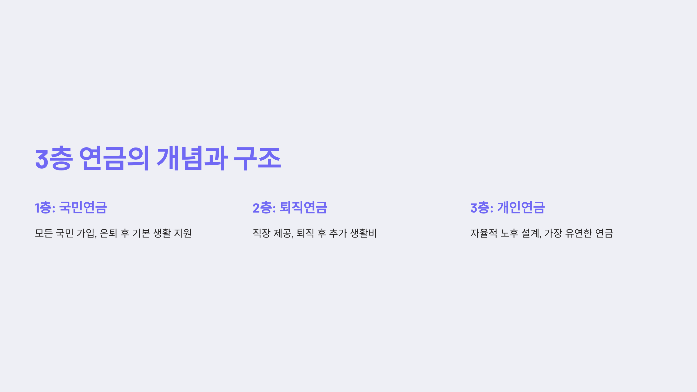퇴직연금은 직장에서 제공하며, 퇴직 후 추가적인 생활비를 제공합니다. - 3층: 개인연금