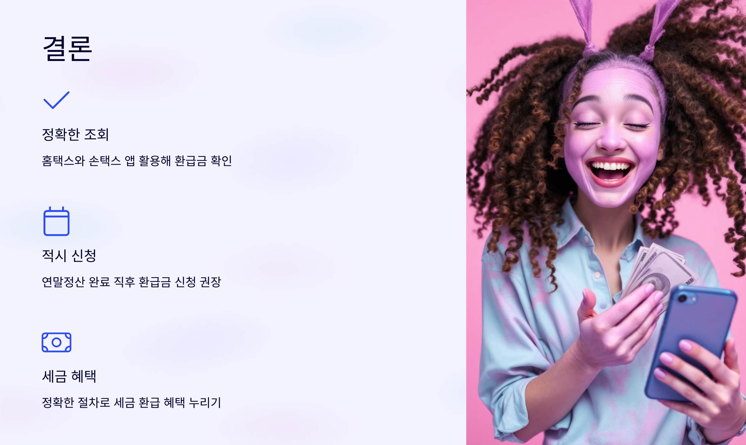 연말정산 환급금은 근로소득자의 중요한 세무 절차 중 하나로, 정확히 조회하고 신청하면 세금 환급 혜택을 누릴 수 있습니다. 국세청 홈택스와 손택스 앱을 적극 활용하여 빠르고 간편하게 확인하고 신청해 보세요.