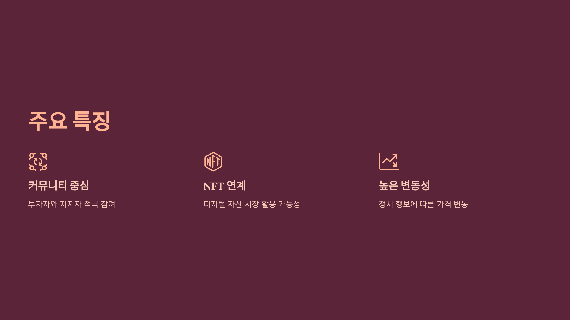 트럼프 전 대통령의 강력한 지지층을 기반으로 밈(meme) 코인의 성격을 띠며, 정치적 팬덤이 가격 형성에 영향을 미칠 수 있습니다.