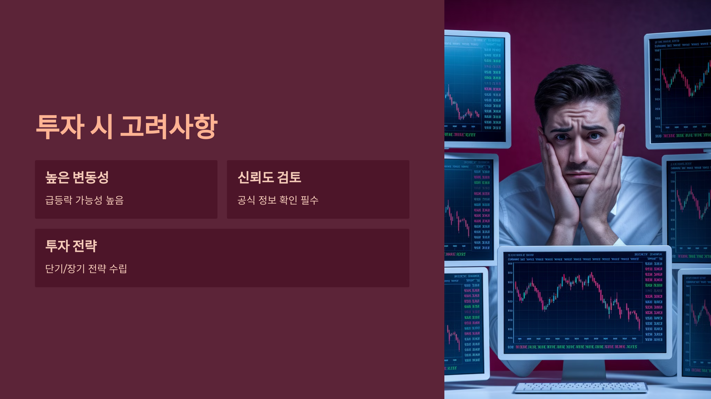 A. 프로젝트의 신뢰성을 검토하고, 공식 백서와 커뮤니티 피드백을 확인하는 것이 중요합니다. 또한, 암호화폐 시장의 변동성이 크므로 무리한 투자보다는 신중한 접근이 필요합니다.