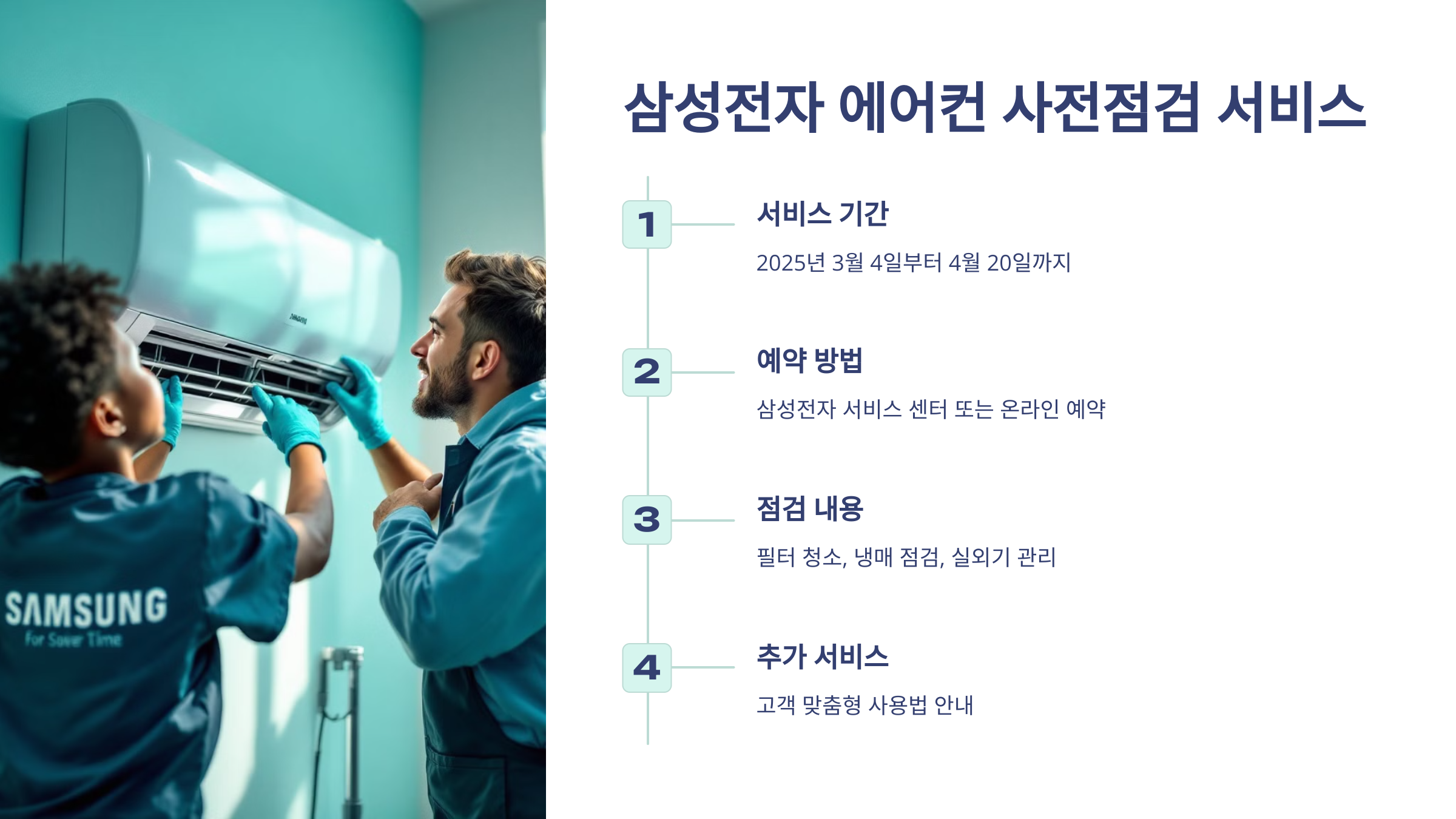 삼성전자는 2025년 3월 4일부터 4월 20일까지 에어컨 사전점검 서비스를 진행합니다.