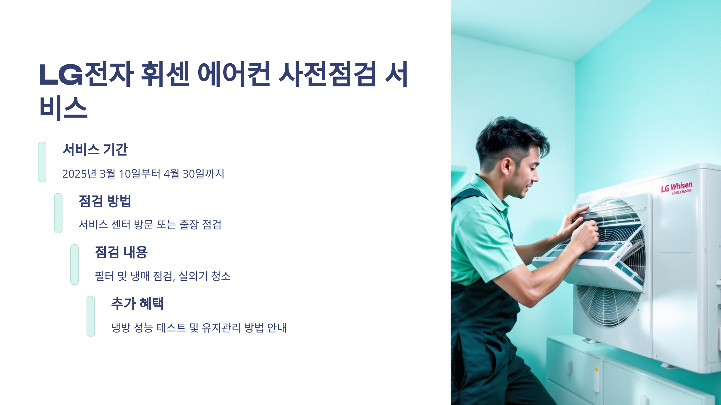 LG전자도 2025년 3월 10일부터 4월 30일까지 휘센 에어컨 사전점검 서비스를 실시합니다.