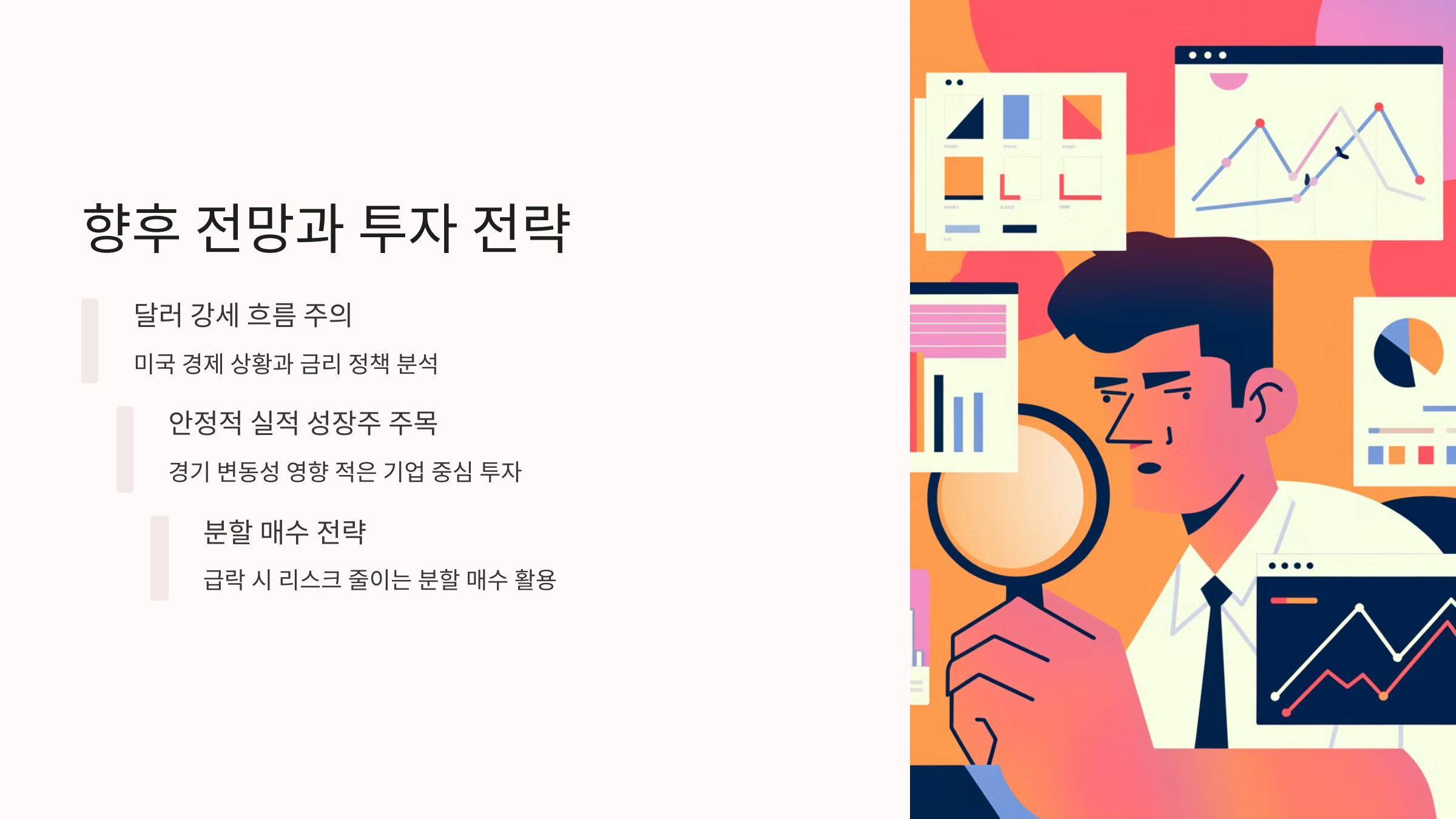 | Q5. 개인 투자자는 어떻게 대응해야 하나요? | 달러 강세 흐름을 주시하면서, 실적이 탄탄한 종목을 중심으로 분할 매수 전략을 활용하는 것이 좋습니다. |