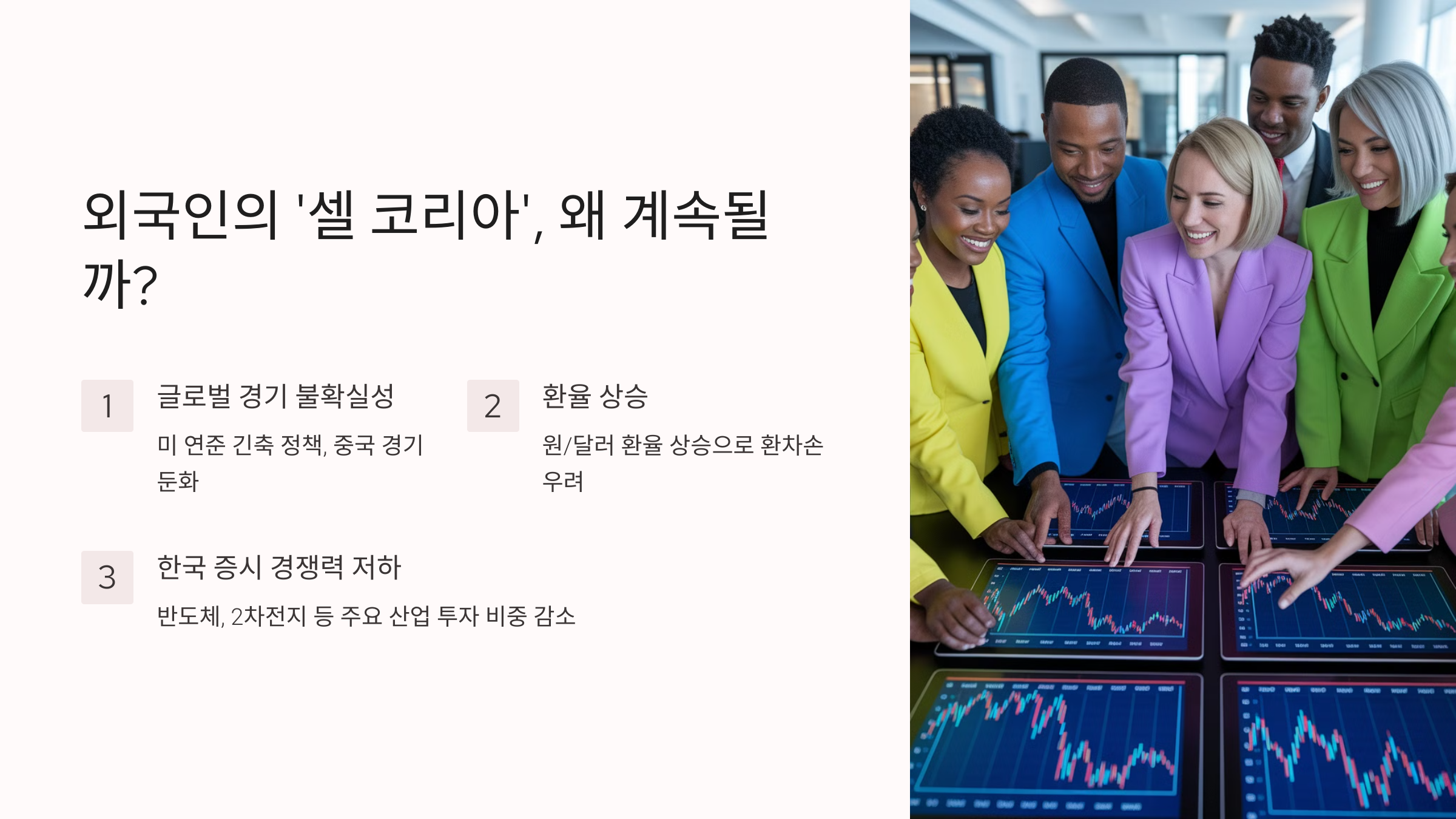 | Q1. 외국인들은 왜 한국 주식을 팔고 있나요? | 글로벌 경기 불확실성과 환율 상승, 한국 증시의 투자 매력 감소가 주요 원인입니다. |