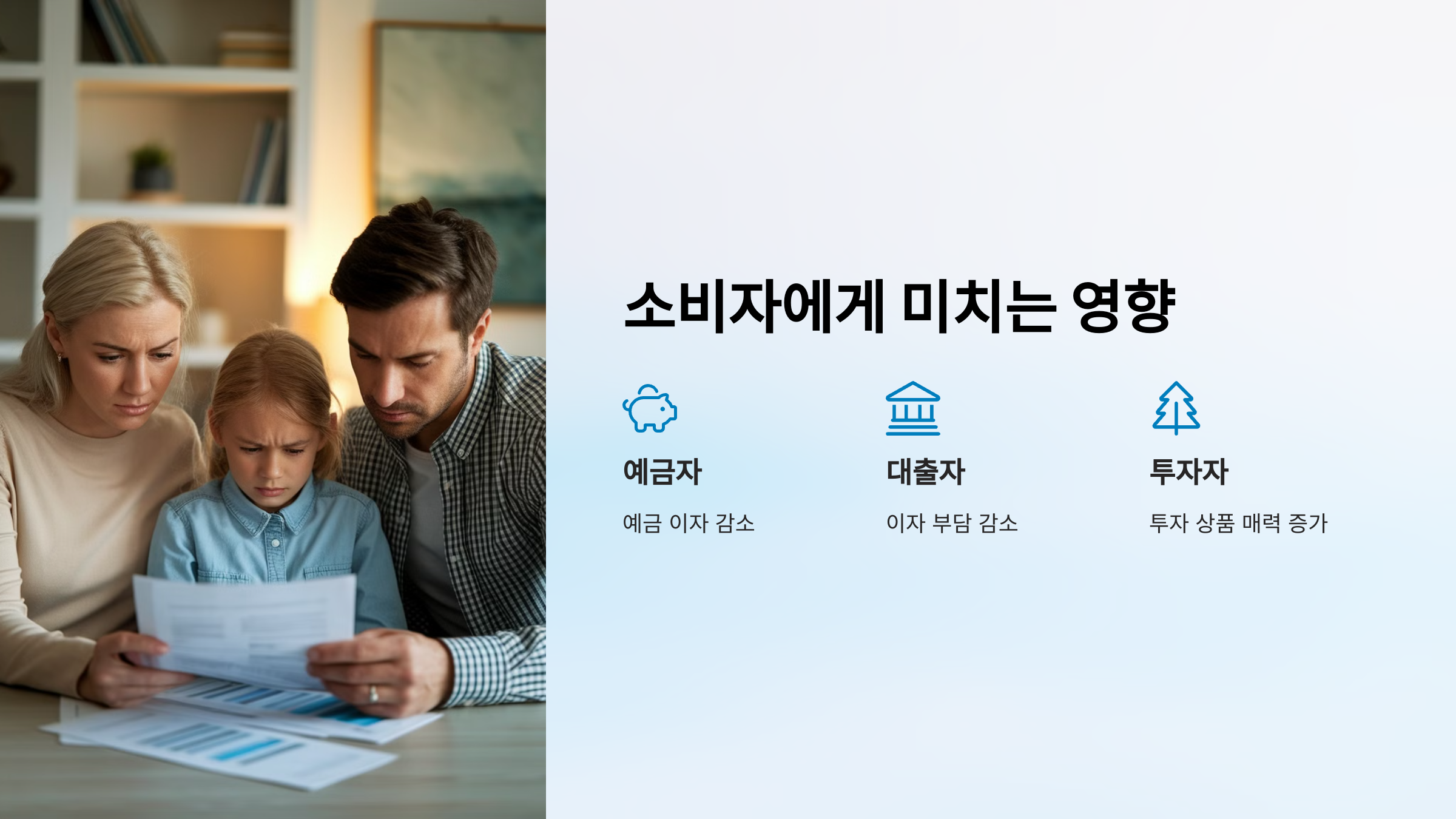 - 예금자: 예금 이자가 줄어들어 수익률이 낮아질 수 있습니다.