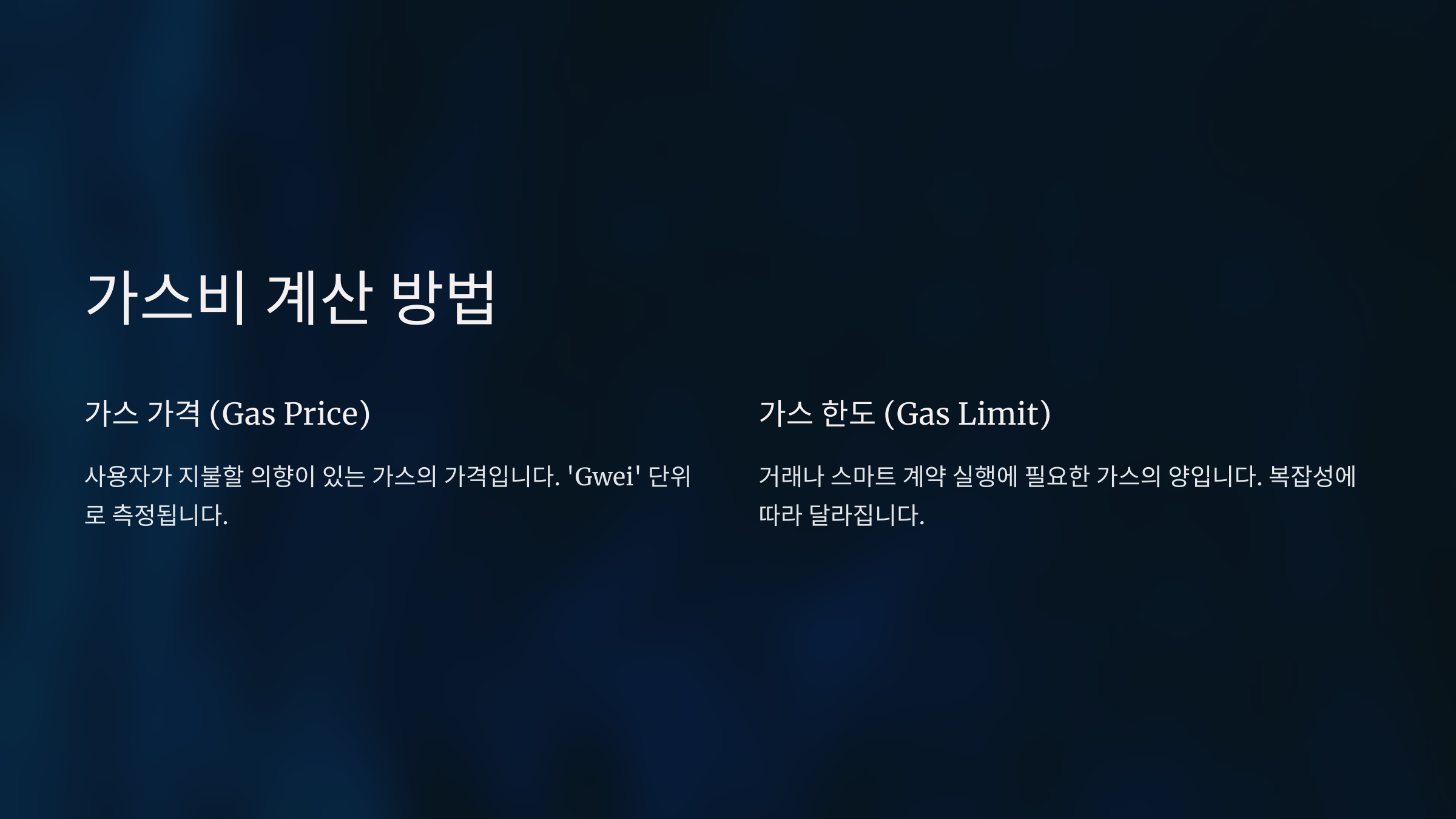 이 비용은 **'가스'**라는 단위로 측정되며, 네트워크에서 트랜잭션을 실행하고 블록을 처리하는데 드는 연산 비용을 나타냅니다.