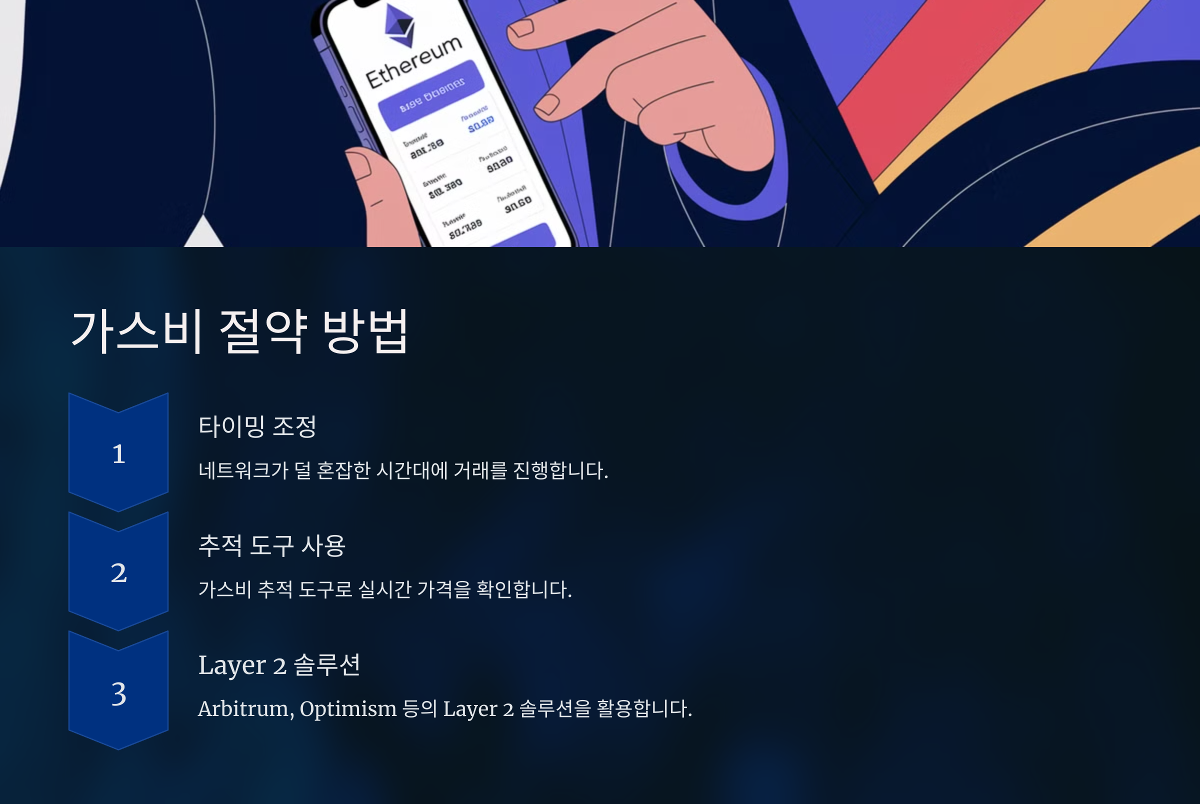 • Layer 2 솔루션 활용: 이더리움의 Layer 2 솔루션(예: Arbitrum, Optimism)을 사용하면 이더리움 메인넷에서 발생하는 가스비를 줄일 수 있습니다. 이 솔루션들은 거래 속도를 높이고 가스비를 절감하는 데 유리합니다.