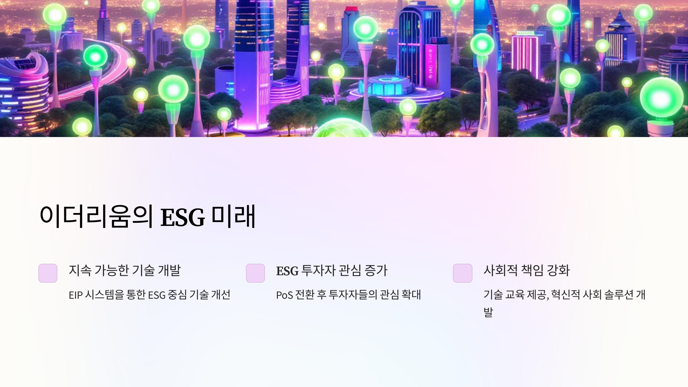 이더리움은 EIP(Ethereum Improvement Proposal) 시스템을 통해 지속적으로 환경적, 사회적, 지배구조적 영향을 고려한 기술 개선을 추진하고 있습니다.