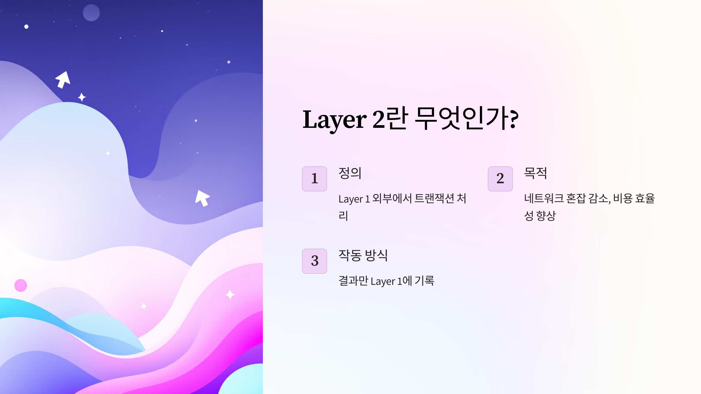 이를 해결하기 위해 등장한 것이 바로 Layer 2 솔루션입니다. Layer 2는 블록체인의 기본 계층인 Layer 1(예: 이더리움 메인넷)의 위에서 작동하며, 효율성과 확장성을 획기적으로 개선하는 기술로 주목받고 있습니다.