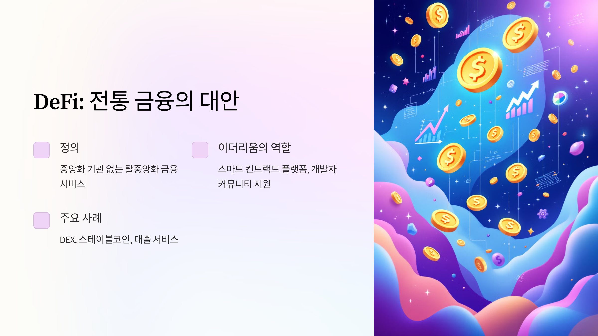 이더리움 기반의 DeFi 애플리케이션은 금융 시스템에 접근할 수 없었던 개인과 지역 사회에 금융 서비스를 제공합니다.