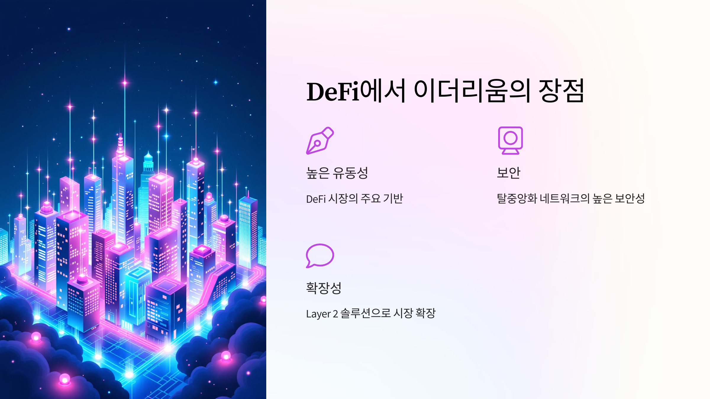 - 다양한 금융 서비스: 대출, 스테이킹, 파생상품 거래 등 다양한 금융 상품이 이더리움 네트워크 위에서 발전하고 있습니다.