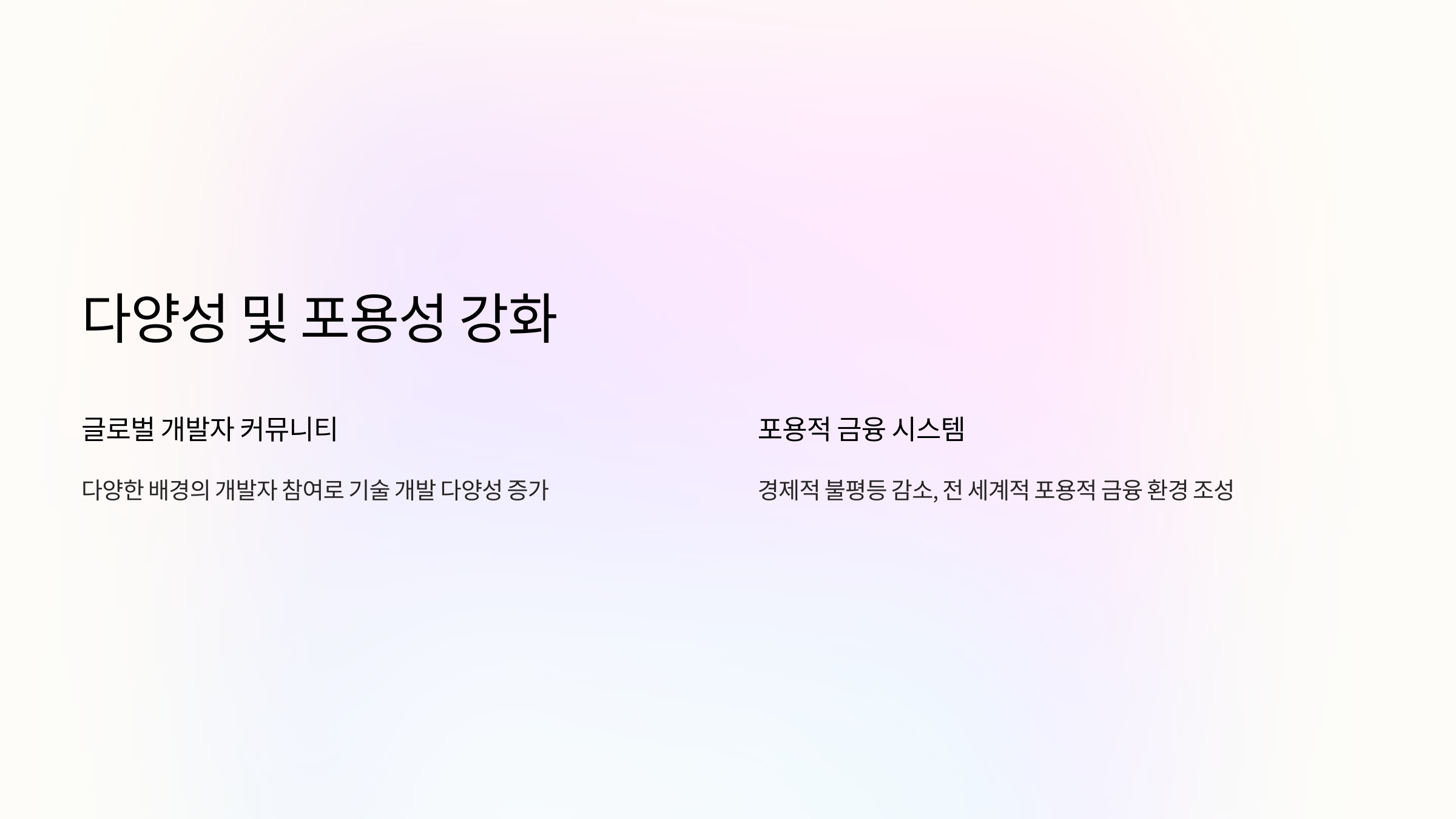 전 세계적으로 다양한 배경을 가진 개발자들이 이더리움 생태계에 기여하며, 기술 개발의 다양성을 높입니다. - 포용적 금융 시스템 구축: