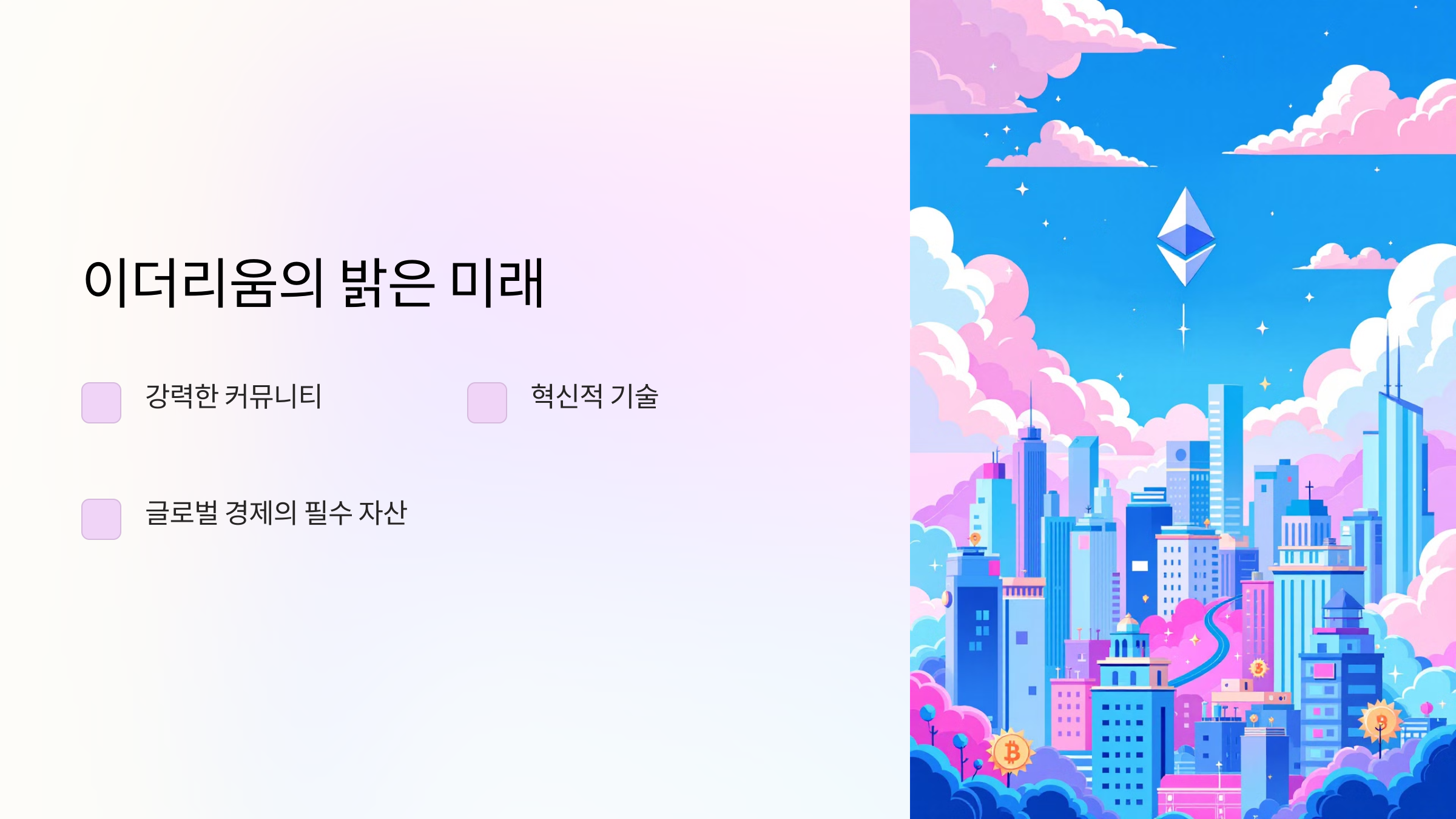 2024년 이후 이더리움은 기술적 진보와 시장 수요를 바탕으로 지속적인 성장을 이어갈 것으로 보입니다. 이더리움 2.0의 완성, DeFi와 NFT의 확장, 그리고 기관 투자와 대규모 채택은 모두 이더리움의 긍정적 전망을 뒷받침하는 요소들입니다. 물론, 규제와 경쟁이라는 도전 과제가 존재하지만, 이더리움은 강력한 커뮤니티와 혁신적인 기술로 이를 극복할 가능성이 높습니다.