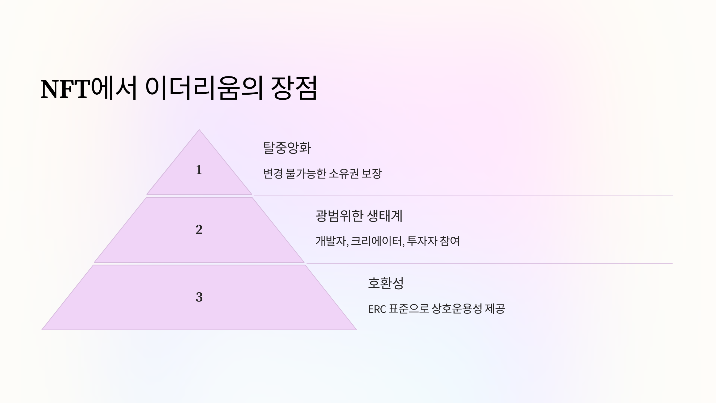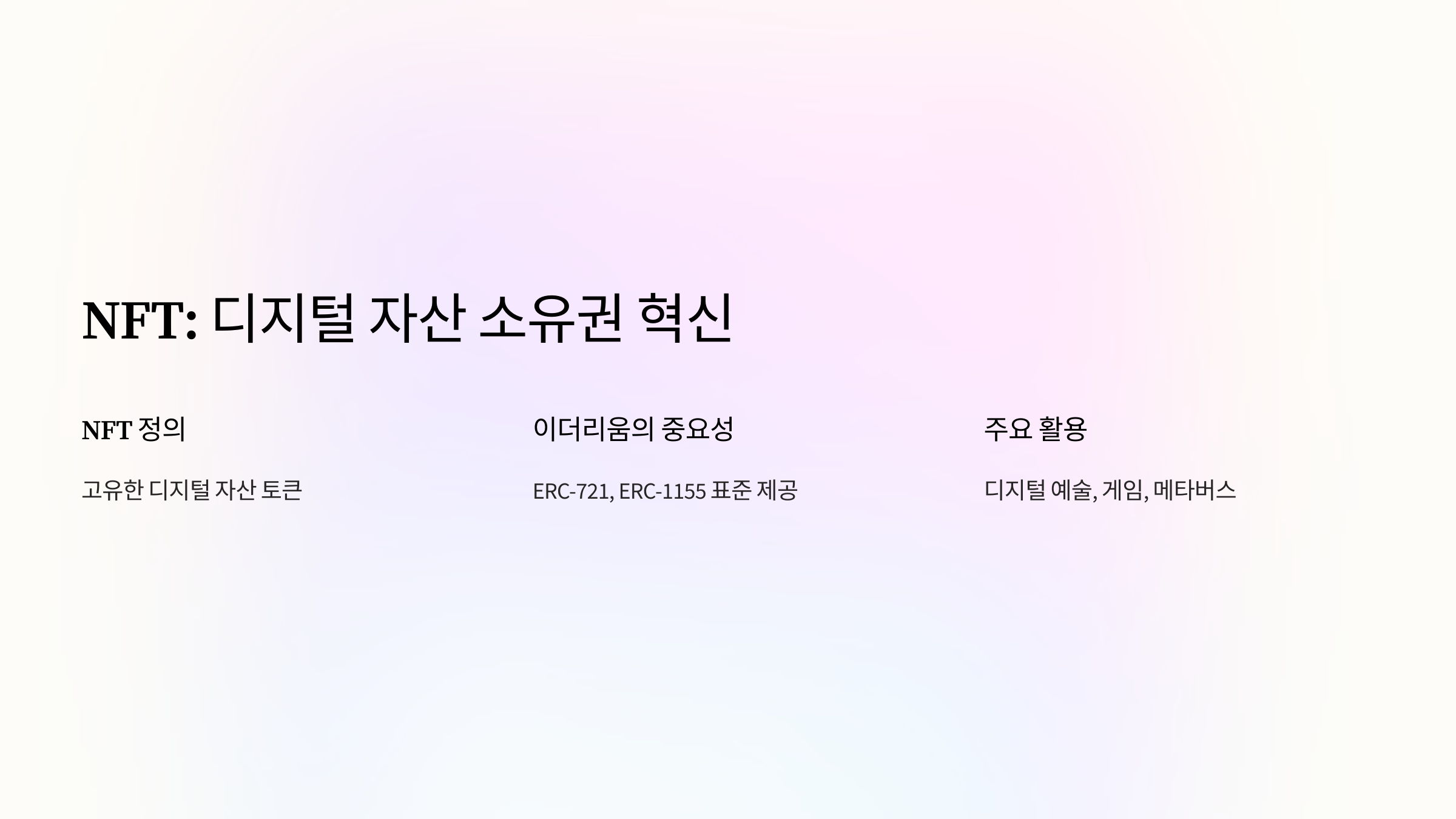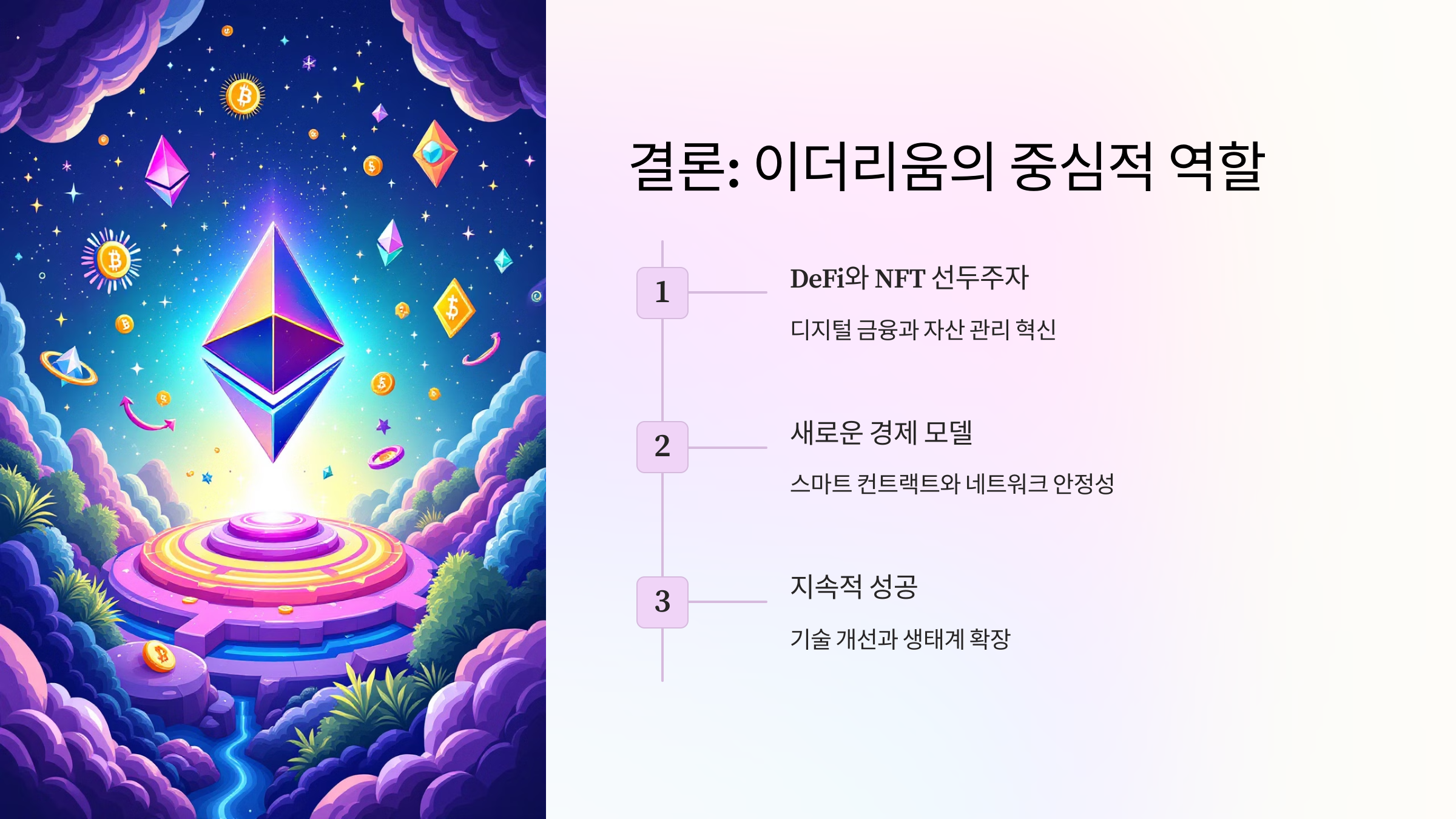 이더리움은 NFT(대체 불가능 토큰)와 웹3.0 기술을 지원하는 주요 플랫폼으로, 새로운 형태의 디지털 자산과 인터넷을 구현하는 데 핵심적인 역할을 하고 있습니다.