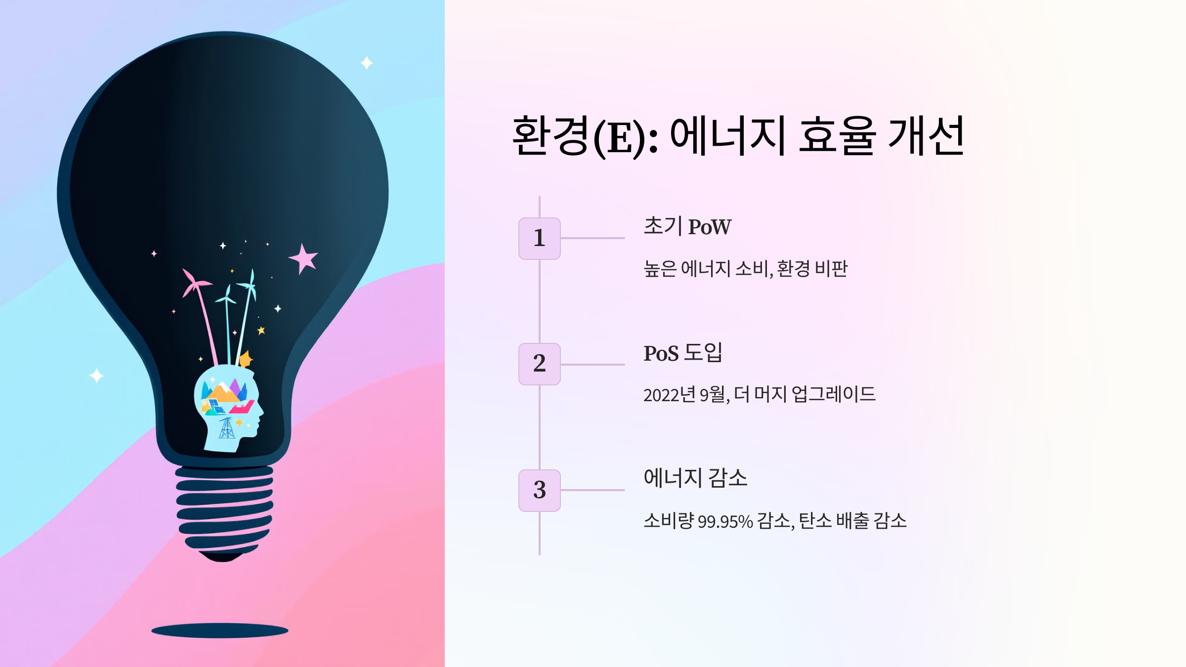 A3. PoS(Proof of Stake)로 전환하면서 에너지 소비를 99.95% 줄여 친환경 블록체인으로 자리 잡았습니다.