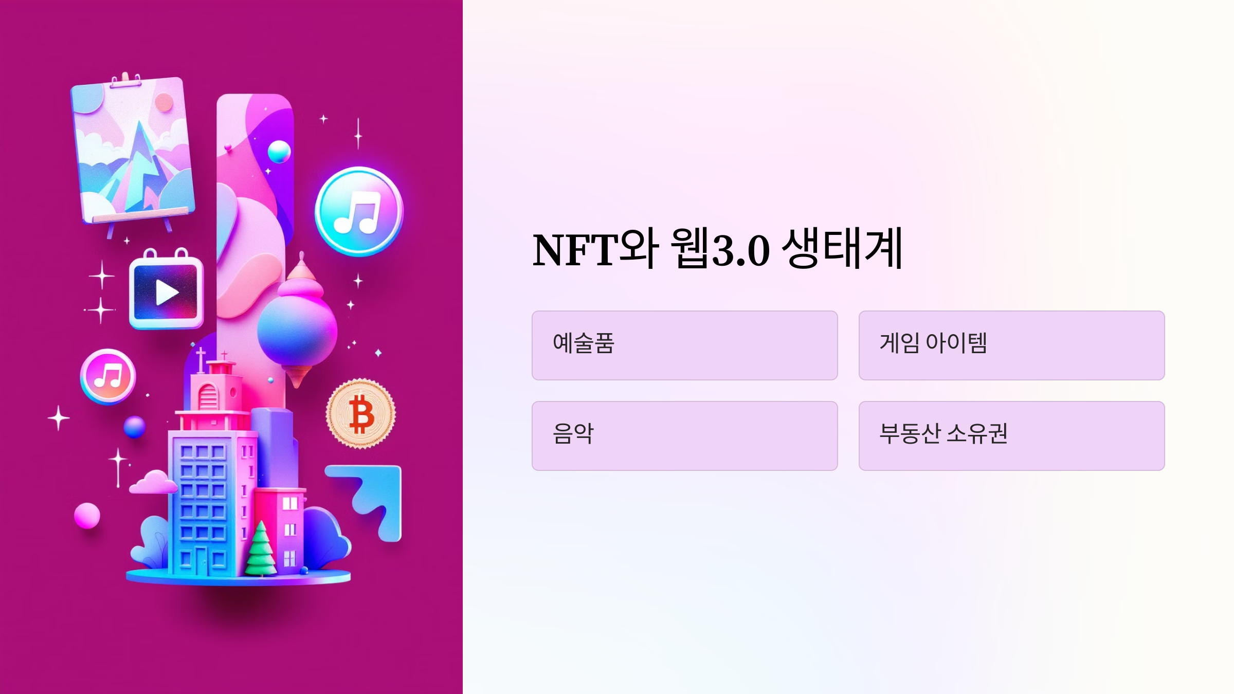 - NFT의 진화: 예술품, 게임 아이템, 음악 및 부동산 소유권 등 NFT의 적용 범위는 점점 더 다양해질 것입니다.