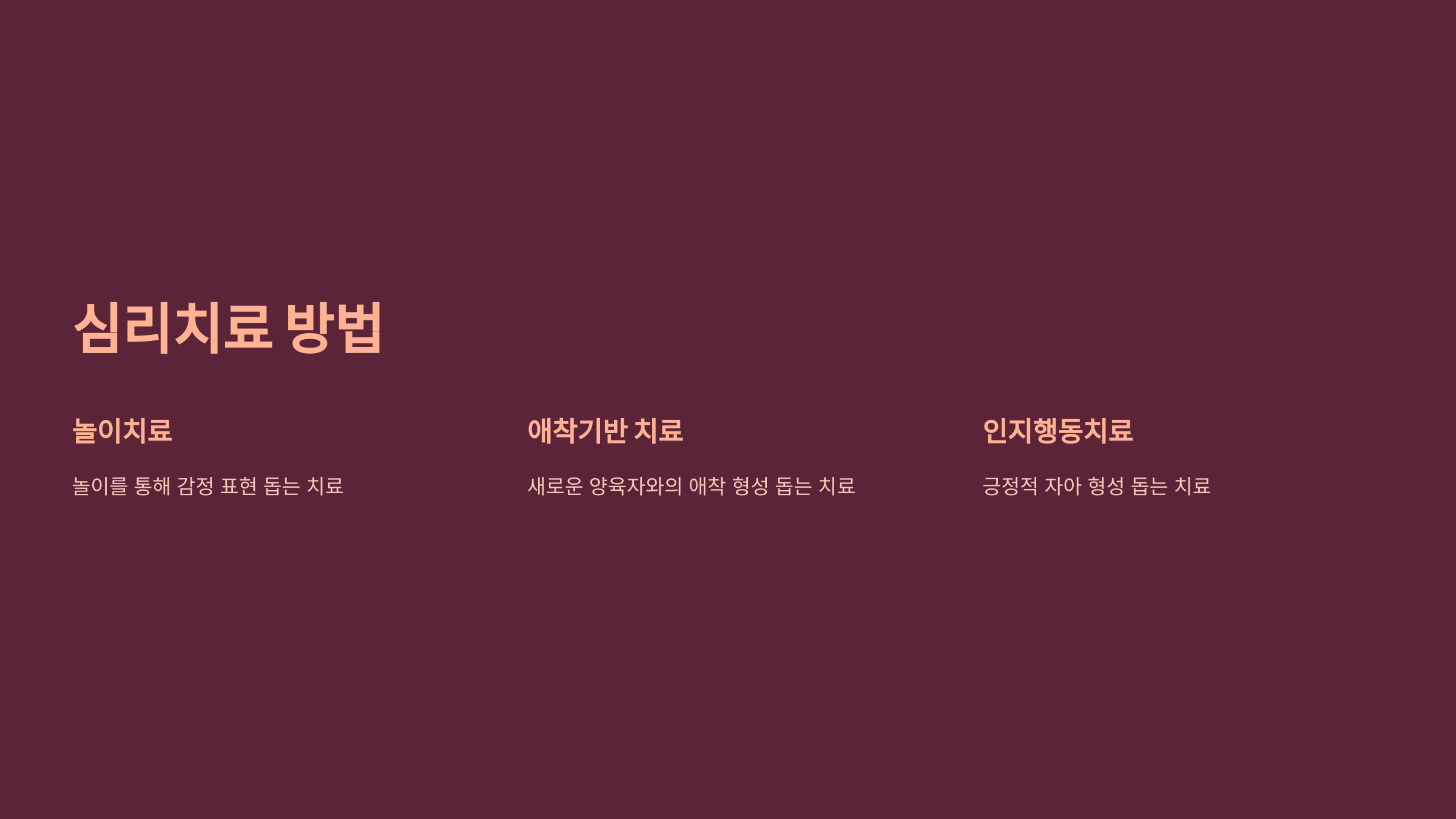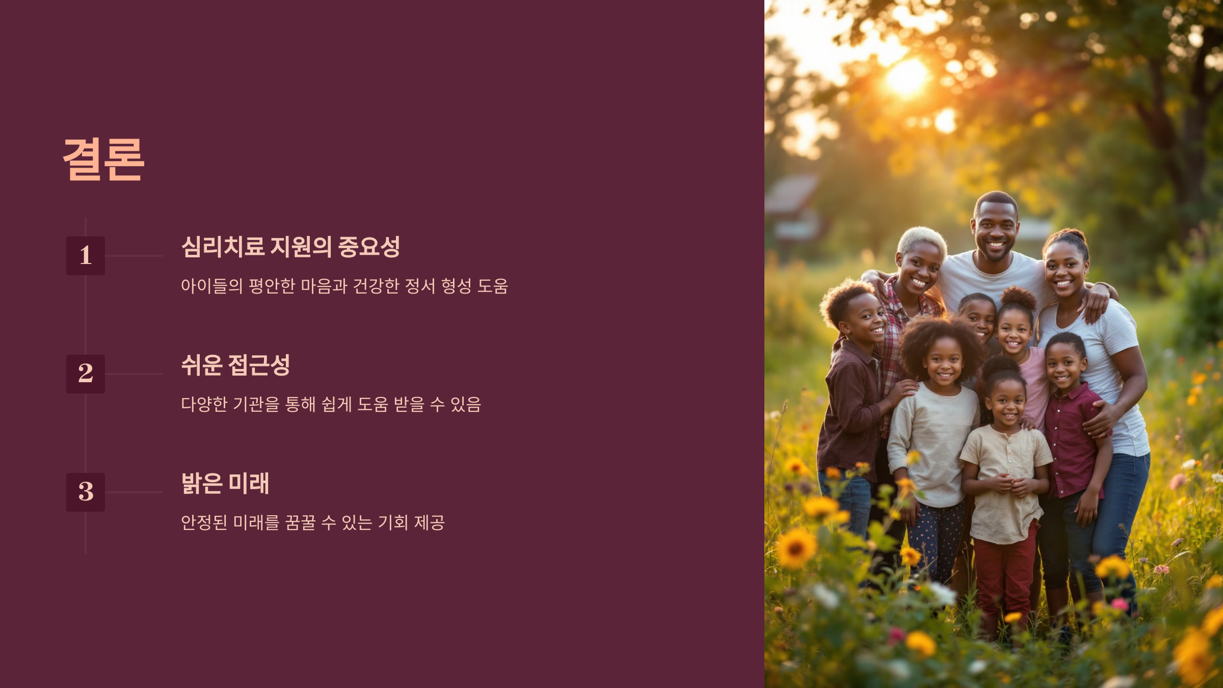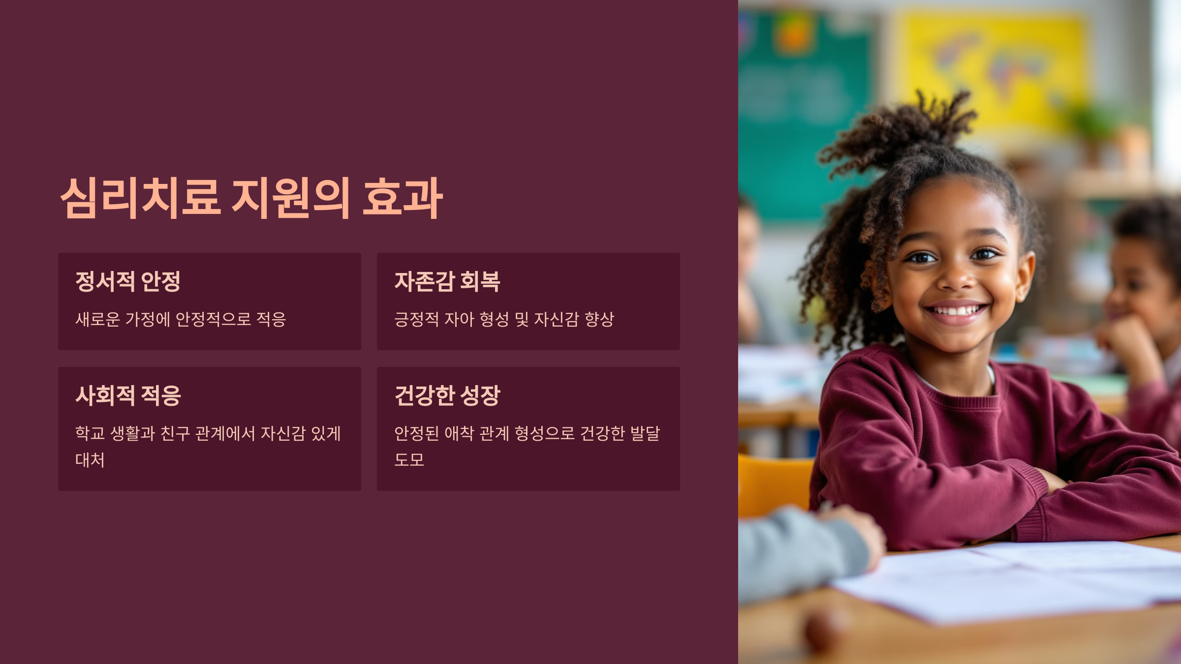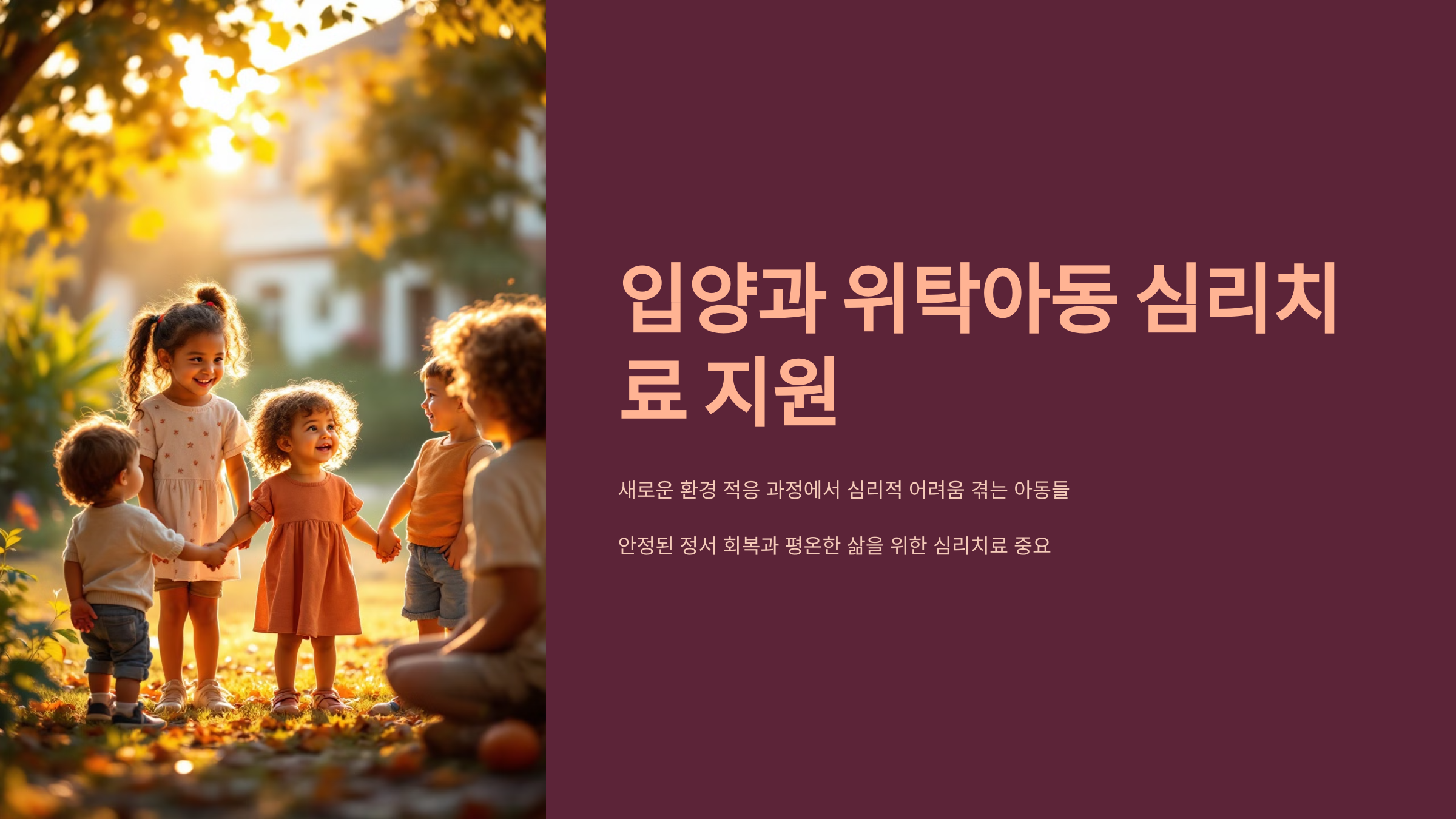 심리치료는 또한 아이가 학교 생활과 친구 관계에서도 자신감 있게 대처할 수 있도록 돕기 때문에, 정서적 안정과 사회적 적응 능력 향상에 큰 도움이 됩니다. 따라서 입양아동과 위탁아동이 건강하게 성장할 수 있도록 심리치료 지원을 받는 것은 매우 중요한 과정입니다.