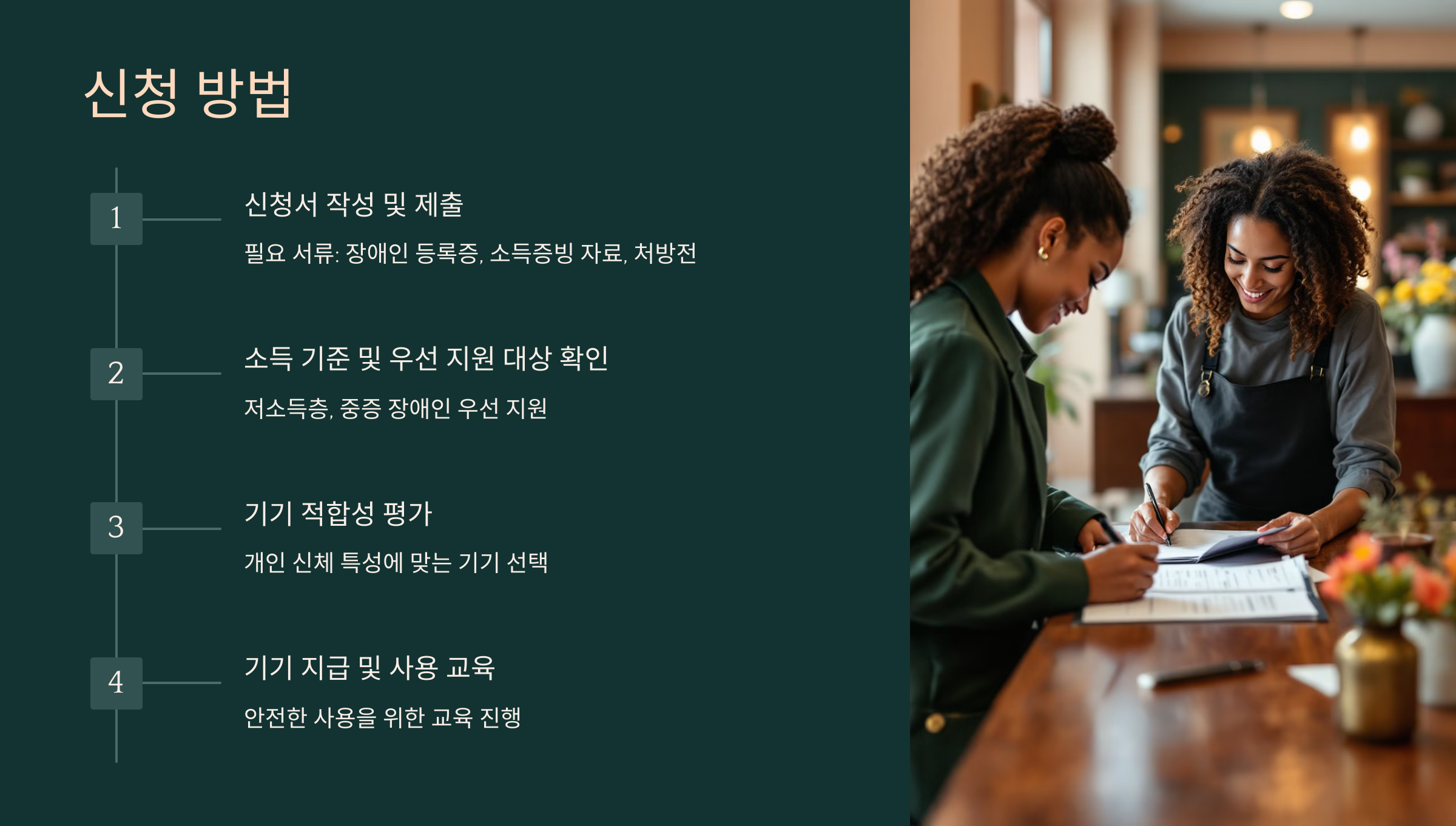 장애인 보조기기 교부를 신청하려면, 지원하고자 하는 보조기기와 본인의 장애 유형에 맞는 신청서를 작성해야 합니다. 필요한 서류는 주로 장애인 등록증, 소득증빙 자료, 처방전 등이 포함될 수 있으니 미리 준비해두는 것이 좋습니다. - 소득 기준과 우선 지원 대상