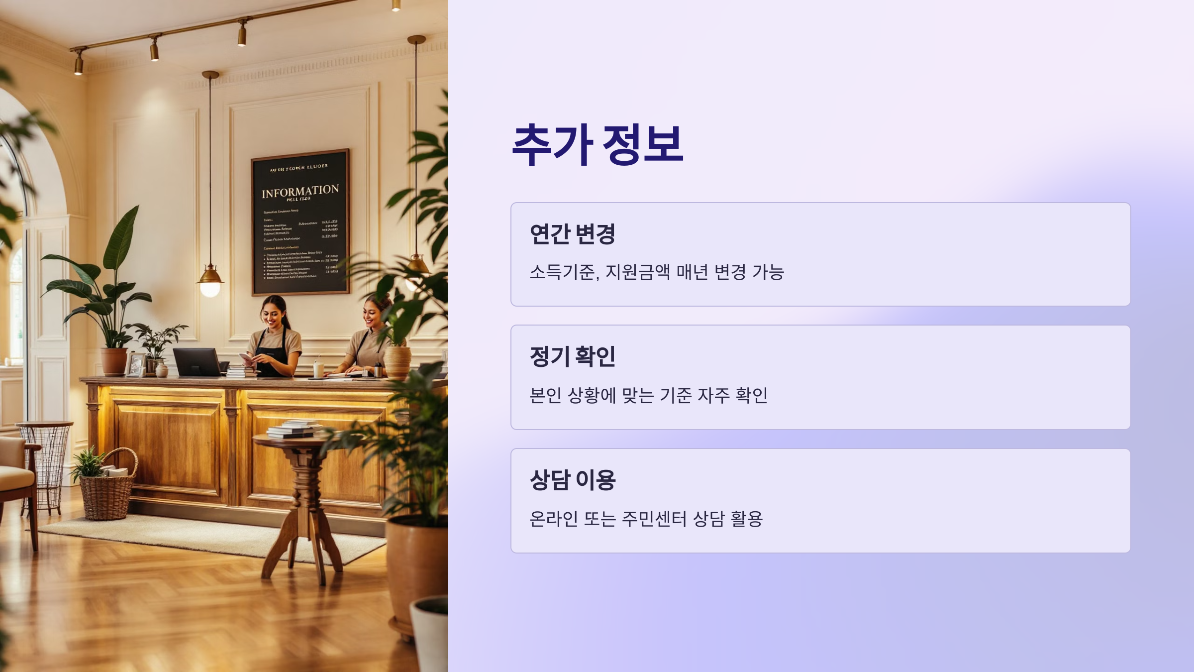 따뜻한 집에서 하루의 피로를 풀고 편안한 마음으로 내일을 맞이할 수 있는 공간, 그곳이 바로 집입니다. 주거급여는 이러한 따뜻한 보금자리를 꿈꾸는 많은 분들에게 꼭 필요한 지원 제도입니다. 나와 내 가족이 보다 편안하고 안정적인 환경에서 지낼 수 있도록 주거급여 제도를 잘 활용해 보세요. 작은 관심과 정보가 나와 가족을 위한 큰 변화를 만들어 줄 것입니다.