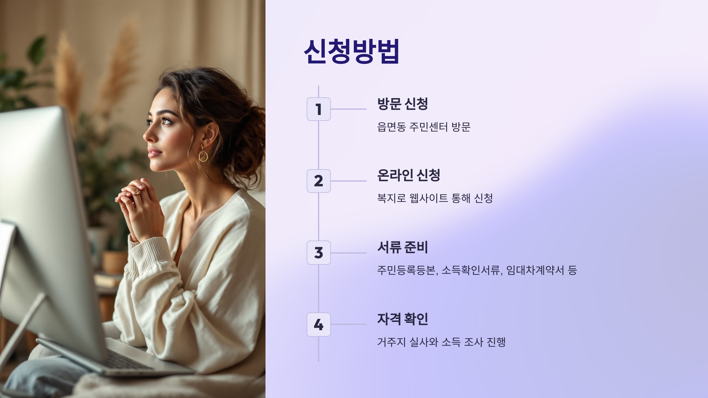 주거급여 신청 방법은 간단합니다. 읍면동 주민센터를 방문하거나 온라인으로 복지로 웹사이트를 통해 신청할 수 있습니다. 주민센터에서는 신청 과정을 친절히 안내해 주며, 필요한 서류 작성도 도와주기 때문에 직접 방문하는 것도 좋은 선택이 될 수 있습니다.