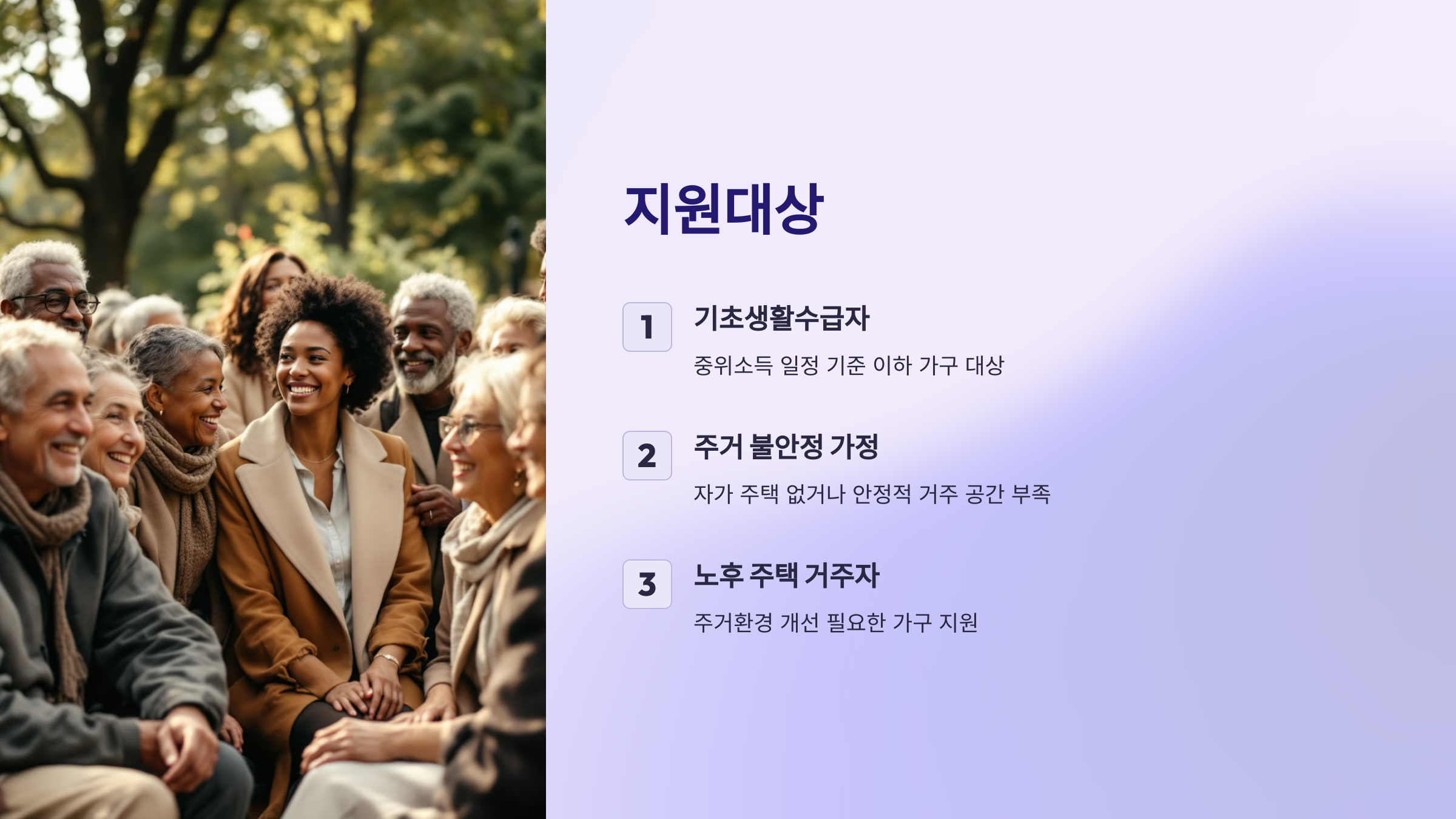 주거급여는 생활이 어려운 가구가 주거 안정을 누릴 수 있도록 돕기 위한 제도입니다. 기초생활수급자 또는 중위소득의 일정 기준 이하 가구라면 누구나 신청할 수 있으며, 가구원 수와 소득 수준에 따라 지원 가능 여부가 결정됩니다. 특히 자가 주택이 없거나 안정적인 거주 공간이 부족해 경제적으로 어려움을 겪는 가정에 따뜻한 보금자리를 마련할 수 있도록 힘이 되어줍니다.