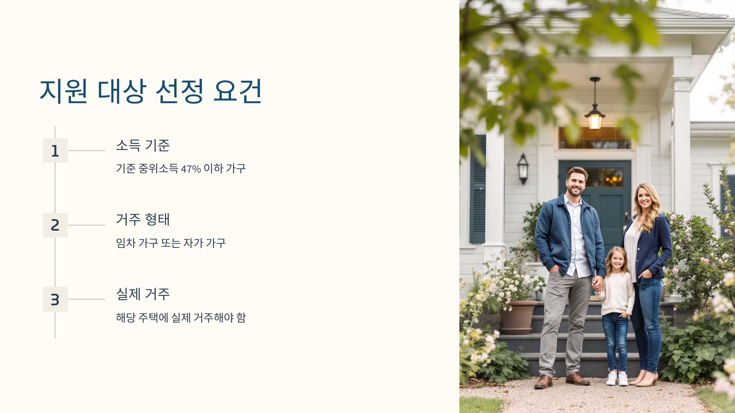 주거급여는 소득, 주거 형태, 가족 구성을 기준으로 대상자를 선정합니다. 2024년에는 다음 세 가지 조건을 충족해야 합니다: