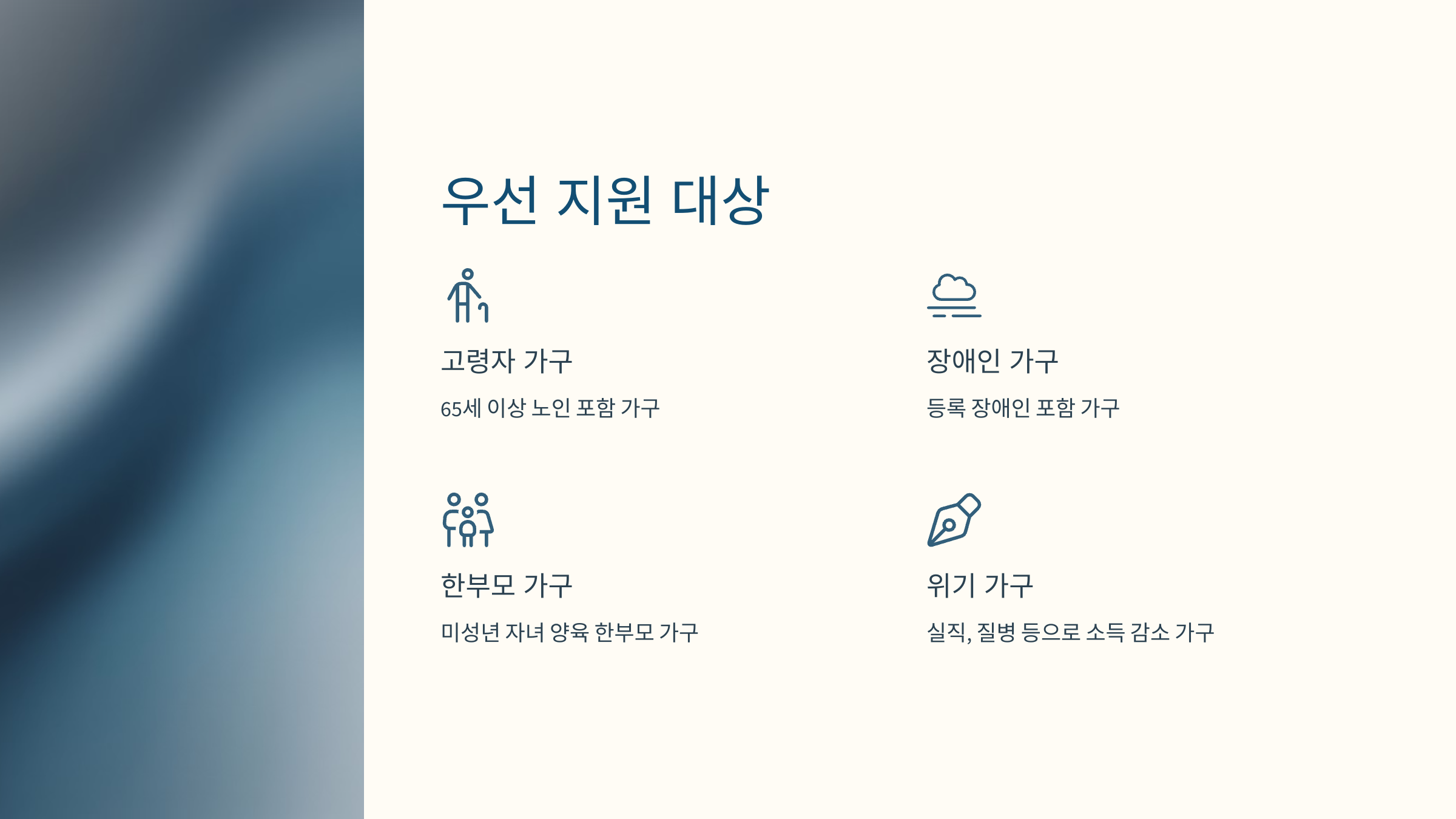 - 특별 지원: 고령자, 장애인 가구는 우선적으로 지원.