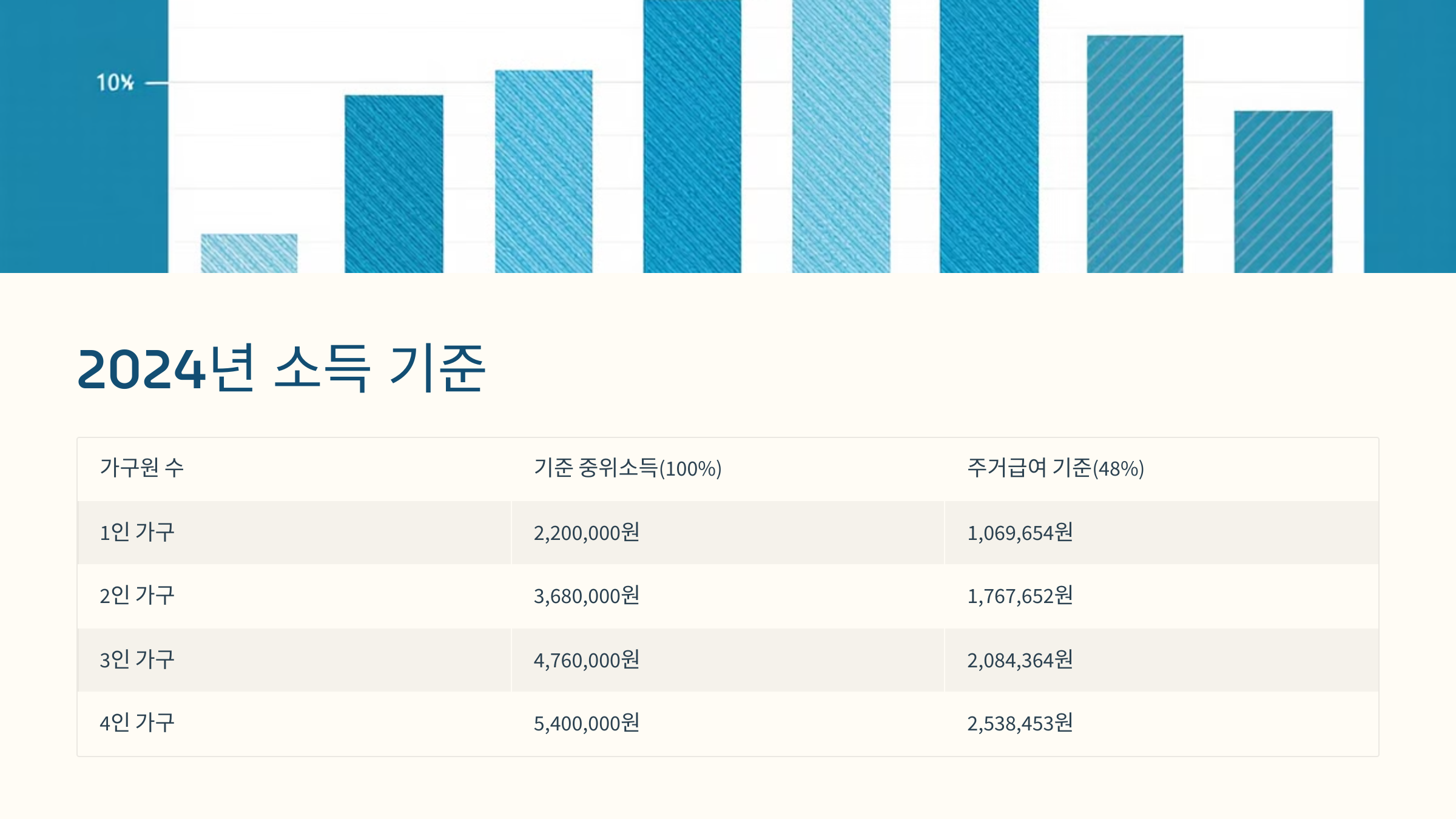 소득 요건은 가구원의 수에 따라 다르게 적용됩니다. 기준 중위소득은 대한민국 가구의 평균 소득을 100%로 보고, 이를 기준으로 48% 이하인 가구가 주거급여 지원을 받을 수 있습니다.