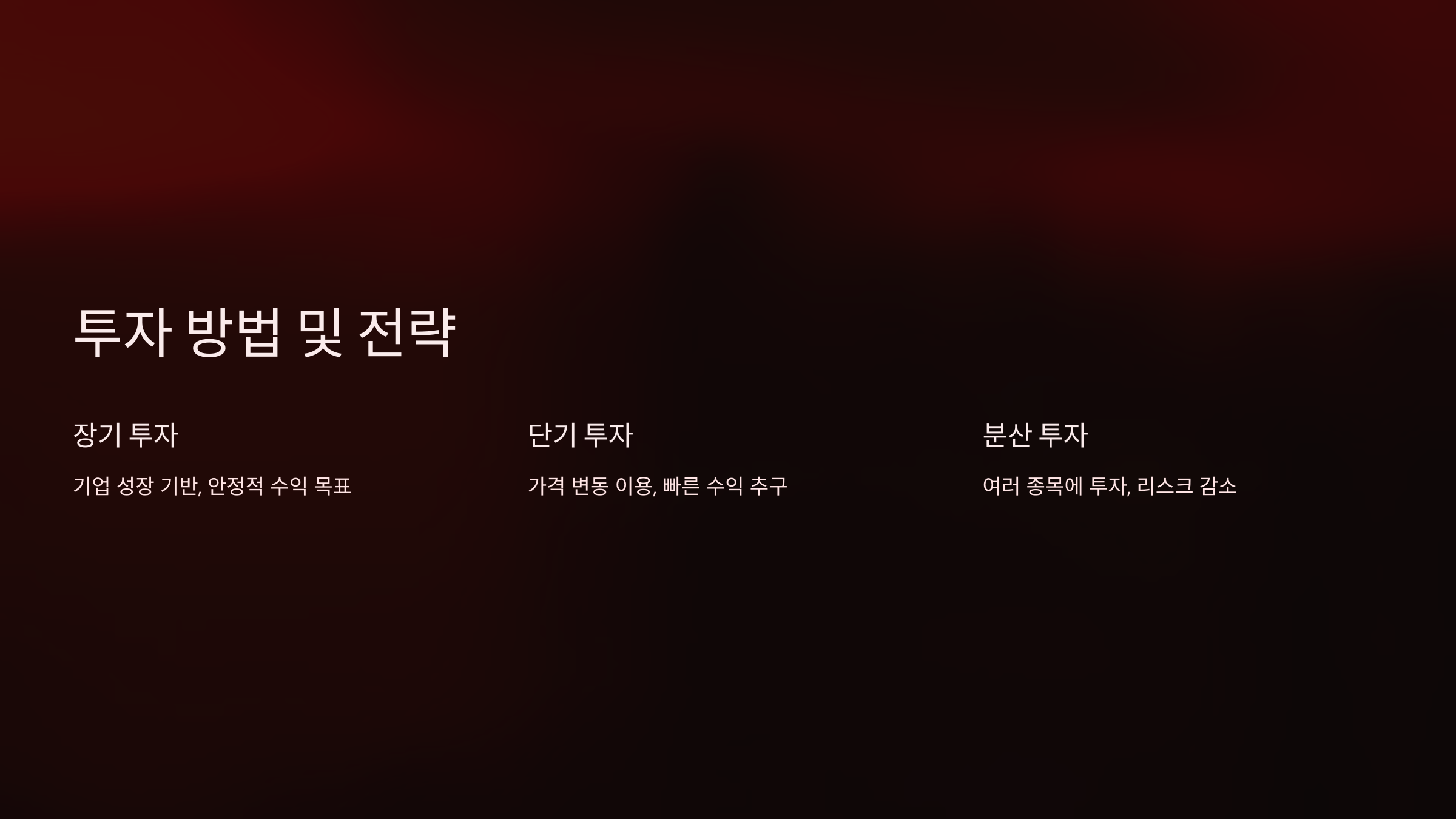 - 장기 투자는 기업의 성장을 기반으로, 수년간 보유하면서 안정적인 수익을 목표로 합니다.