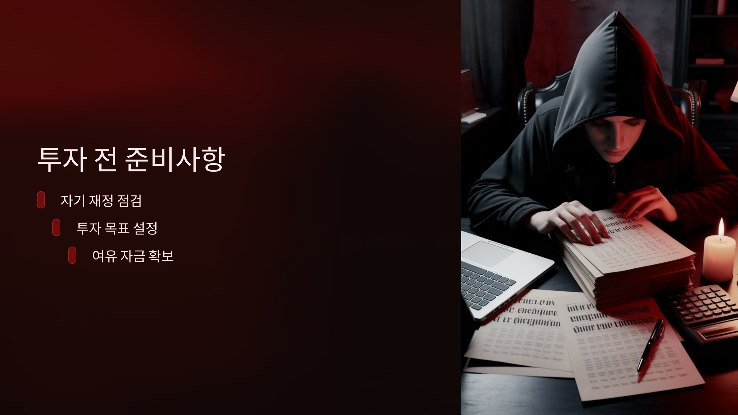 - 자기 재정 점검: 투자 전, 자신의 재정 상태를 점검하고 여유 자금을 투자하는 것이 중요합니다. 생활비와 비상금을 먼저 확보하세요.