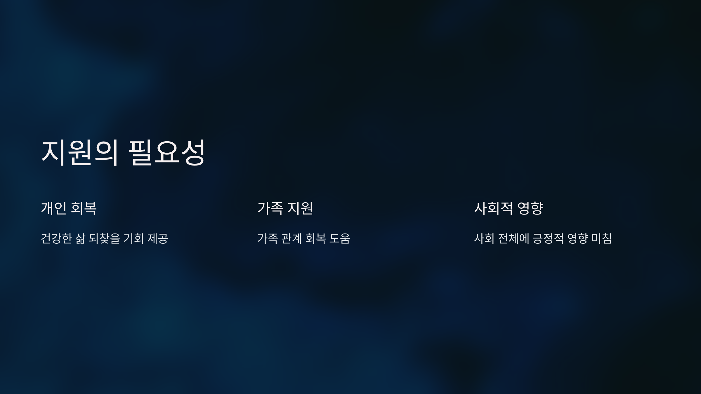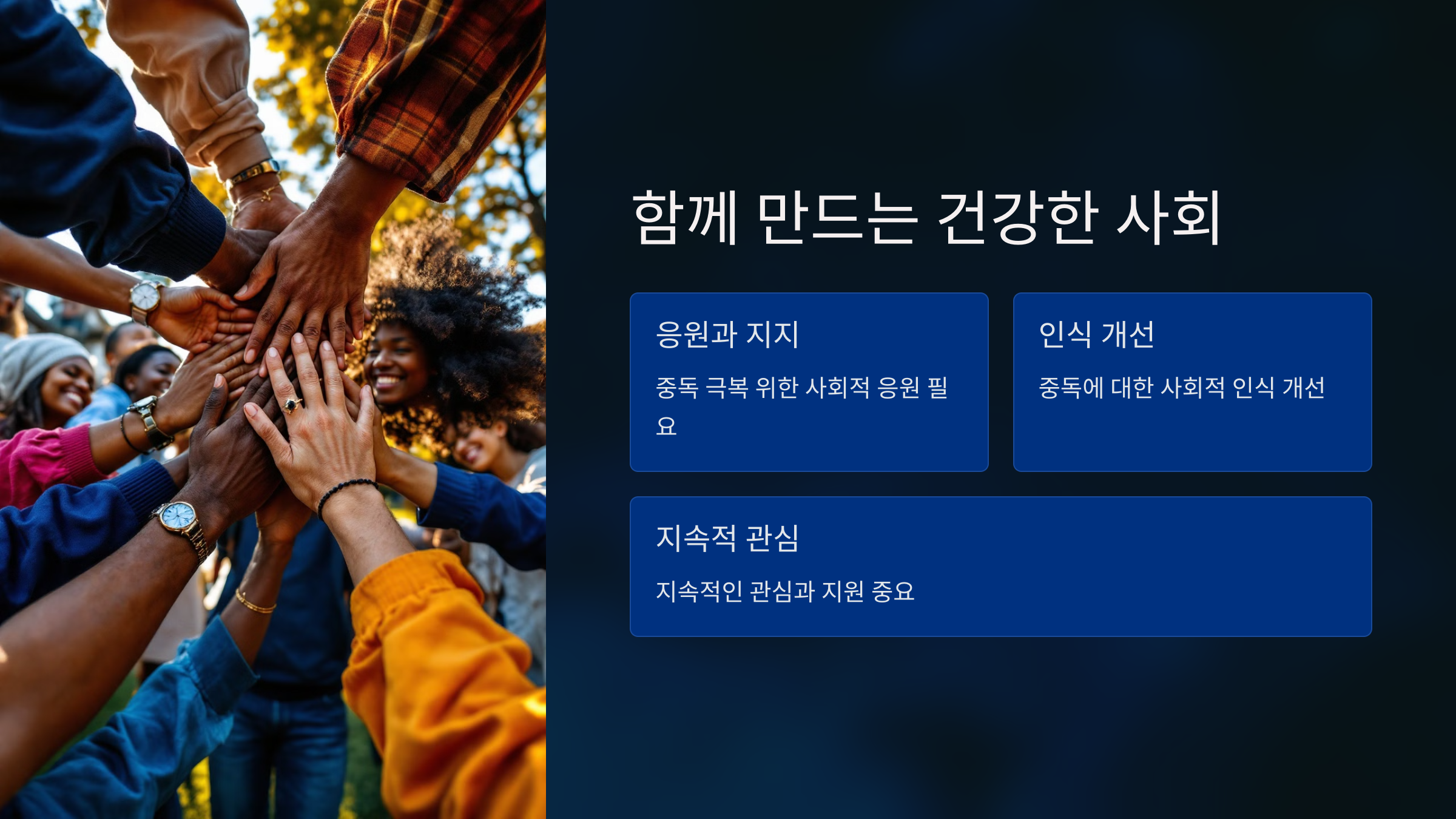 중독관리 통합지원센터 운영을 통해 많은 사람들이 더 나은 삶으로 나아갈 수 있도록 함께 응원해 주세요. 이 소중한 지원을 통해, 모두가 건강하고 밝은 삶을 만들어 나가기를 바랍니다.