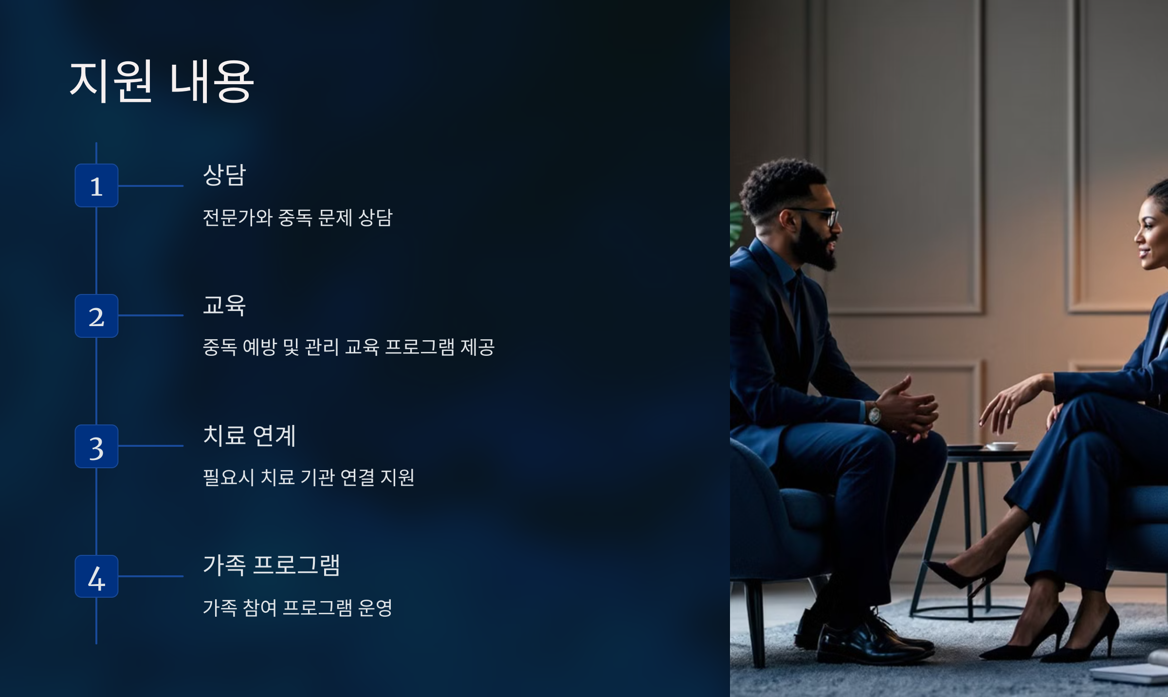 중독관리 통합지원센터 운영에서는 중독 문제를 해결하기 위한 상담과 교육 프로그램을 제공해요. 먼저 전문가와의 상담을 통해 자신의 중독 문제를 솔직히 이야기하고, 이를 해결하기 위한 방법을 찾아 나가요. 필요에 따라 치료를 받을 수 있는 연결도 도와주고, 가족들이 함께 참여할 수 있는 프로그램도 마련되어 있어요. 또한, 중독 예방을 위한 교육도 제공하여, 중독 문제를 미리 막을 수 있는 도움을 줍니다.