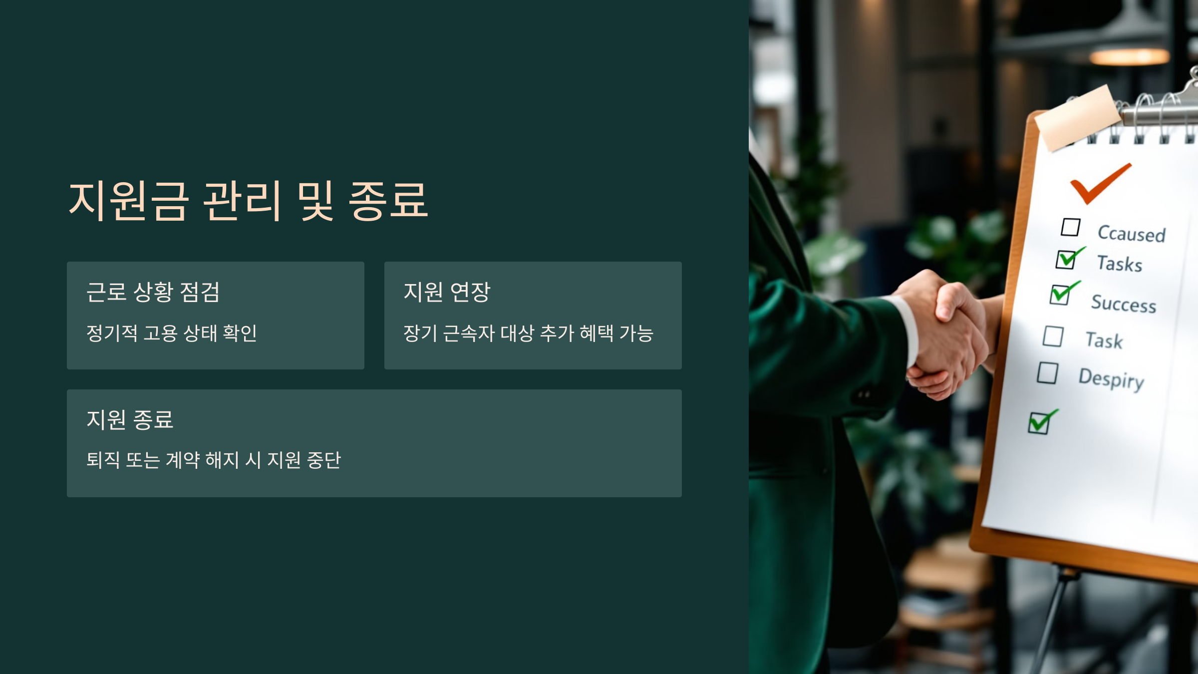 - 지원 연장: 장기 근속자의 경우, 고용 기간에 따라 지원금을 연장하거나 추가 혜택을 받을 수 있습니다.