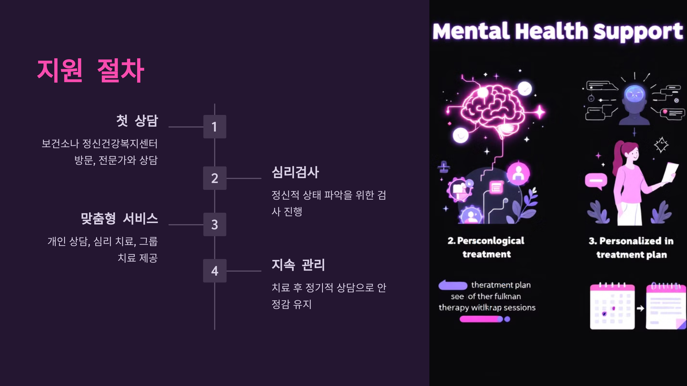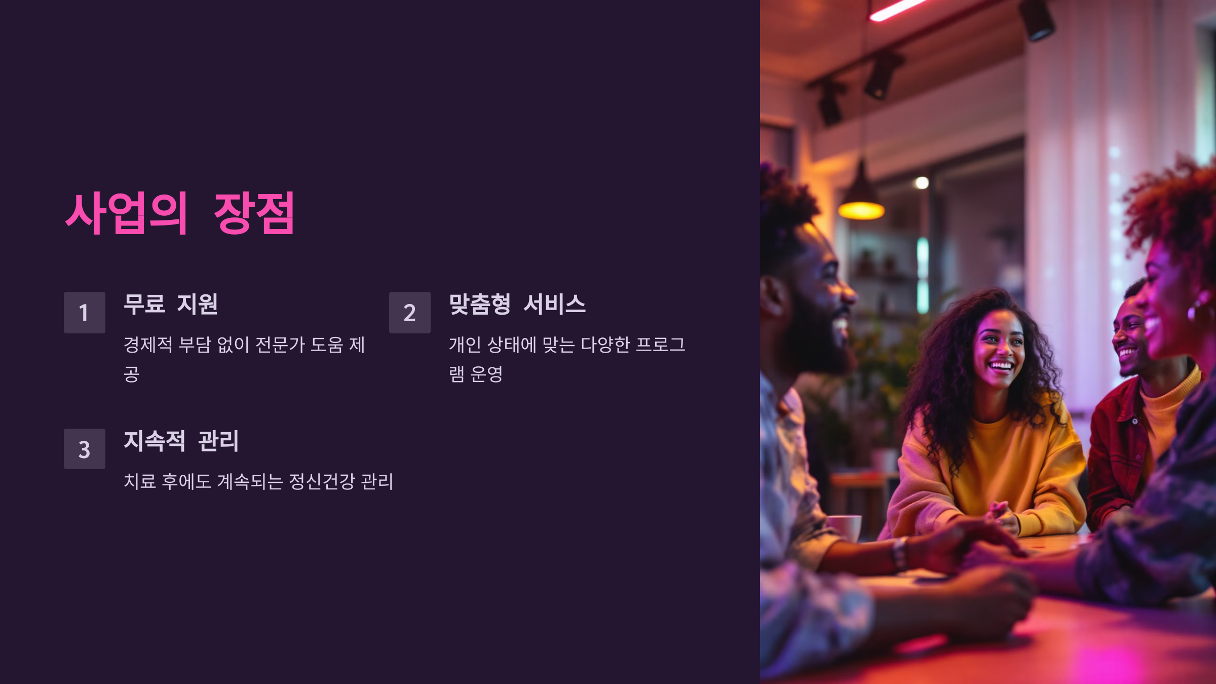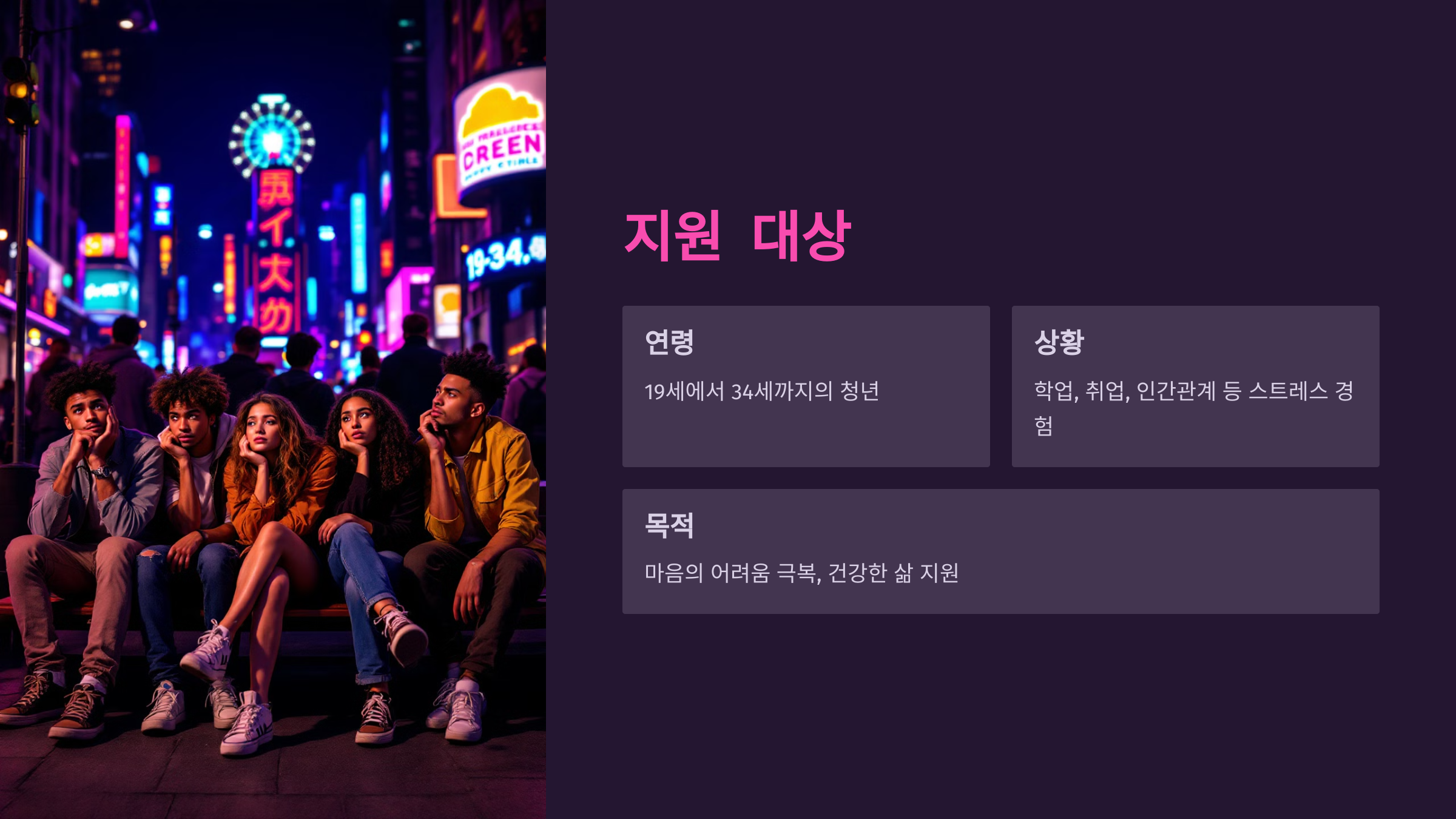 심리검사와 상담을 바탕으로, 청년들에게 맞춤형 지원이 제공됩니다. 서비스는 개인 상담, 심리 치료, 그룹 치료, 정서적 지원 프로그램 등 다양합니다. 또한, 스트레스 관리 교육이나 정신건강 예방 프로그램도 함께 제공되어, 청년들이 스스로 마음을 잘 돌볼 수 있도록 돕습니다. 이러한 서비스는 전액 무료로 제공되기 때문에, 경제적 부담 없이 마음 건강을 챙길 수 있습니다. - 지속적인 지원과 관리