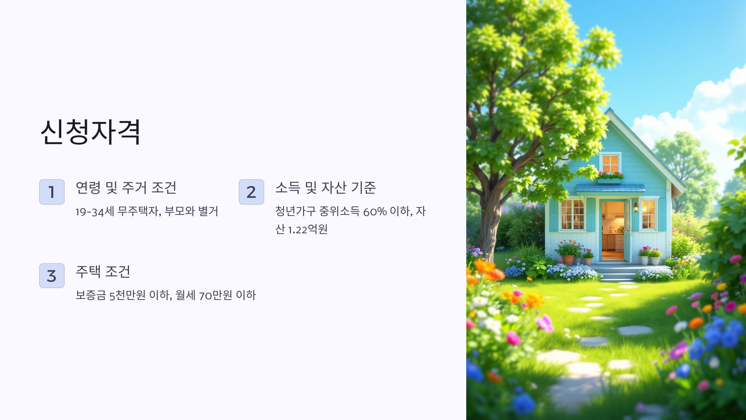 - 청년가구 중위소득 60%이하, 자산 1.22역원+원가구(청년,부모) 중위소득 100%이하 자산 4.7억원